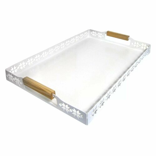 Поднос выполнен в элегантном белом цвете, который легко впишется в любой интерьер и станет гармоничным дополнением к вашей сервировке. Деревянные ручки обеспечивают удобство и комфорт при использовании.