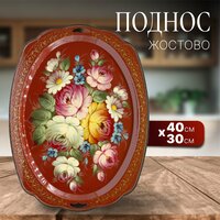 Поднос Жостово Букет выполнен из качественного металла, что обеспечивает его прочность и долговечность. Благодаря прямоугольной форме и размерам 40х30 см, поднос удобен для размещения различных предметов и продуктов.