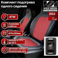 WideMedia ZG2. Самый популярный комплект подогревов. Большая прямоугольная кнопка хорошо вписывается в приборные панели большинства японских автомобилей. Продается комплектом на одно сидение. 2 режима нагрева. Наша компания предлагает подогревы сидений WideMedia на российском рынке с 2011 года. Мы можем с уверенностью рекомендовать их для вас и ваших клиентов. Мягкое полотно совершенно незаметно даже под тонкой обивкой сидений. При производстве используются самые качественные комплектующие. Широкий выбор моделей удовлетворит любого клиента. Ну и, конечно, цена. Не будем забывать и про это преимущество. Подогрев сидений комплект на одно сиденье скрытой установки:◦ 2 нагревательных элемента 470 * 250 мм (размер активной зоны 400 * 240 мм)◦ 2 режима нагрева с подсветкой◦ Рабочее напряжение 13,8 В◦ Потребляемая мощность 47W◦ Температура нагрева 37 - 65 °С ◦ Пористая ткань пропускающая воздух◦ Нагревательный элемент - нагревательная, пожаробезопасная нить