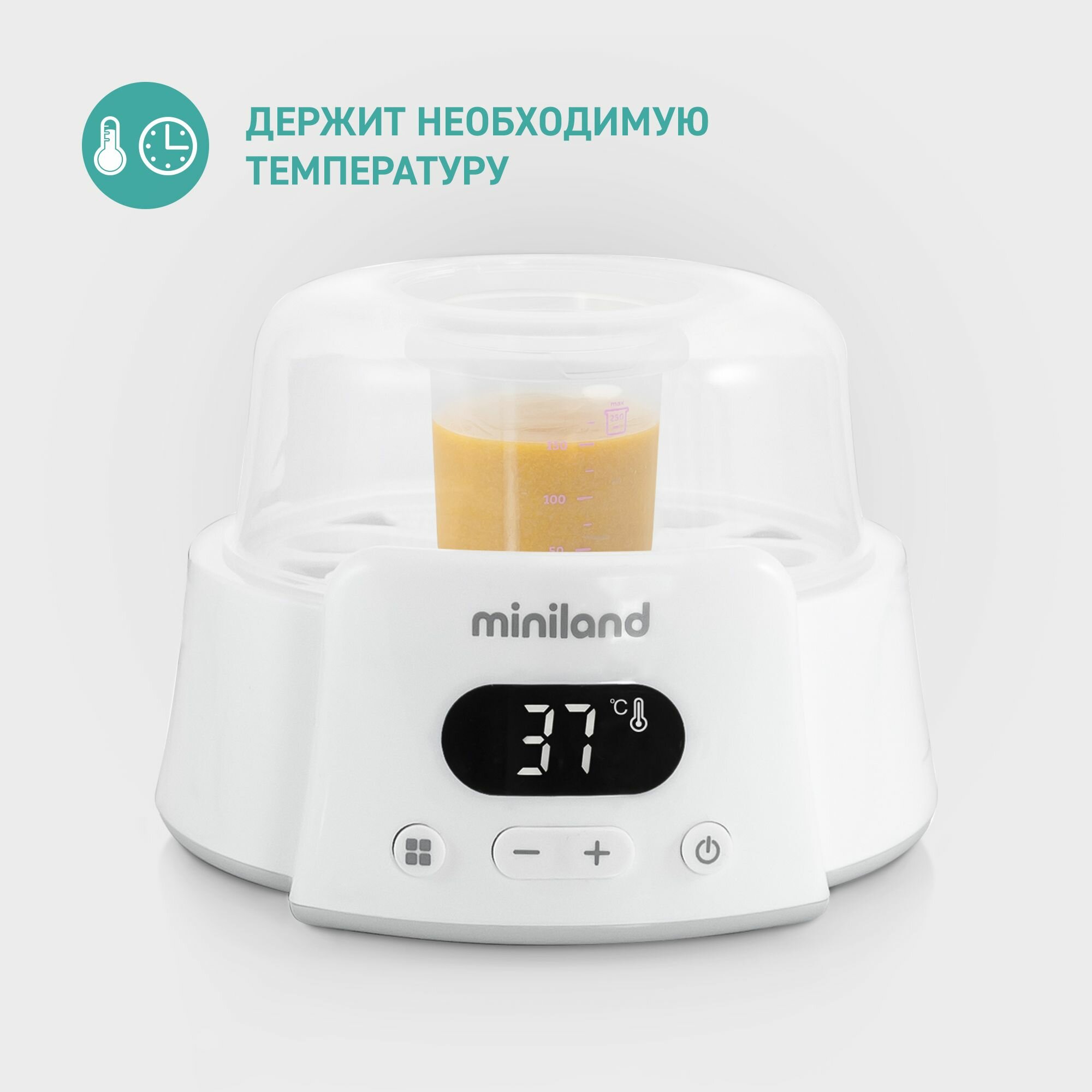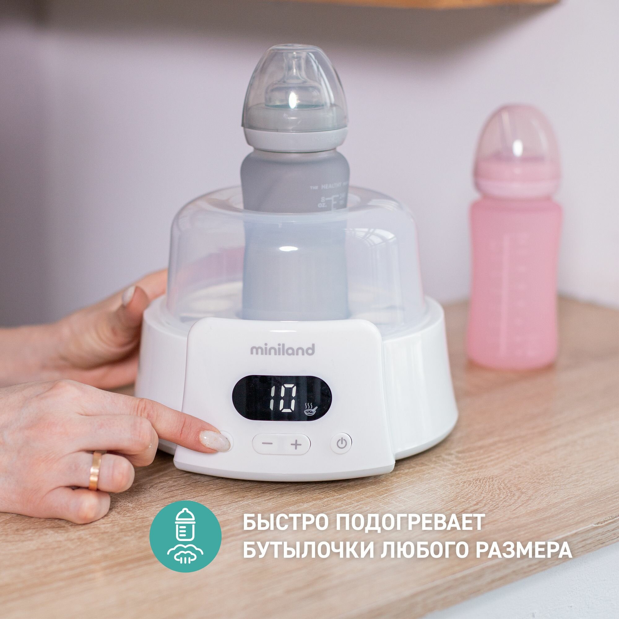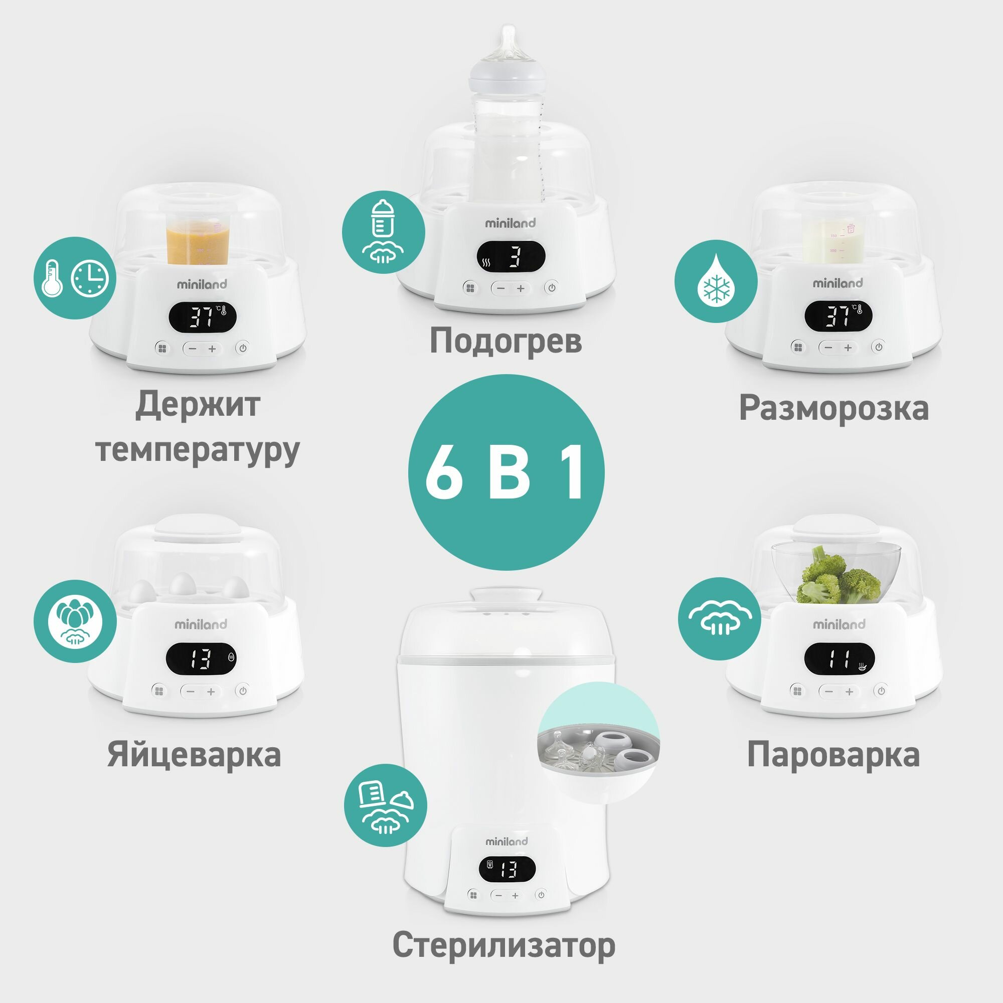Многофункциональный умный прибор Super 6 от Miniland — идеальный помощник на кухне с компактным дизайном, высокой производительностью и полезными функциями: Стерилизует до 6 бутылочек и других аксессуаров одновременно. Готовит полезную еду на пару для прикорма (возможна варка до 6 яиц в течение нескольких минут). Размораживает продукты. Равномерно подогревает бутылочку с молоком и детское питание. Поддерживает заданную температуру детских бутылочек и баночек. Преимущества: Большая емкость. Цифровой интуитивно понятный дисплей позволяет выбирать время нагрева и стерилизации, а также отображать оставшееся время процесса на дисплее. Экран с подсветкой. Световой и звуковой индикаторы. Функция автоматического отключения. Все элементы легко очищаются от остатков еды, упрощая уход за техникой и экономя время и силы молодых родителей. Компактные размеры. С помощью такого устройства молодые родители экономят время и средства, поскольку нет необходимости покупать отдельную технику для каждой функции! Super 6 - верный спутник для мам, которые начинают переход от смешанного или искусственного вскармливания к прикорму малыша и общему столу. Miniland Super 6 - это целых 6 приборов в 1 корпусе: Стерилизатор: эффективная и естественная стерилизация с помощью пара. Нет необходимости использовать какие-либо химические средства для стерилизации. Подогреватель: мягко нагревает бутылочку с молоком и детское питание, сохраняя при этом все свойства материнского молока, витамины и питательные вещества. Пароварка. Разморозка: равномерное размораживание продуктов детского питания. Поддержание температуры еды и жидкости в заданном диапазоне. Яйцеварка.