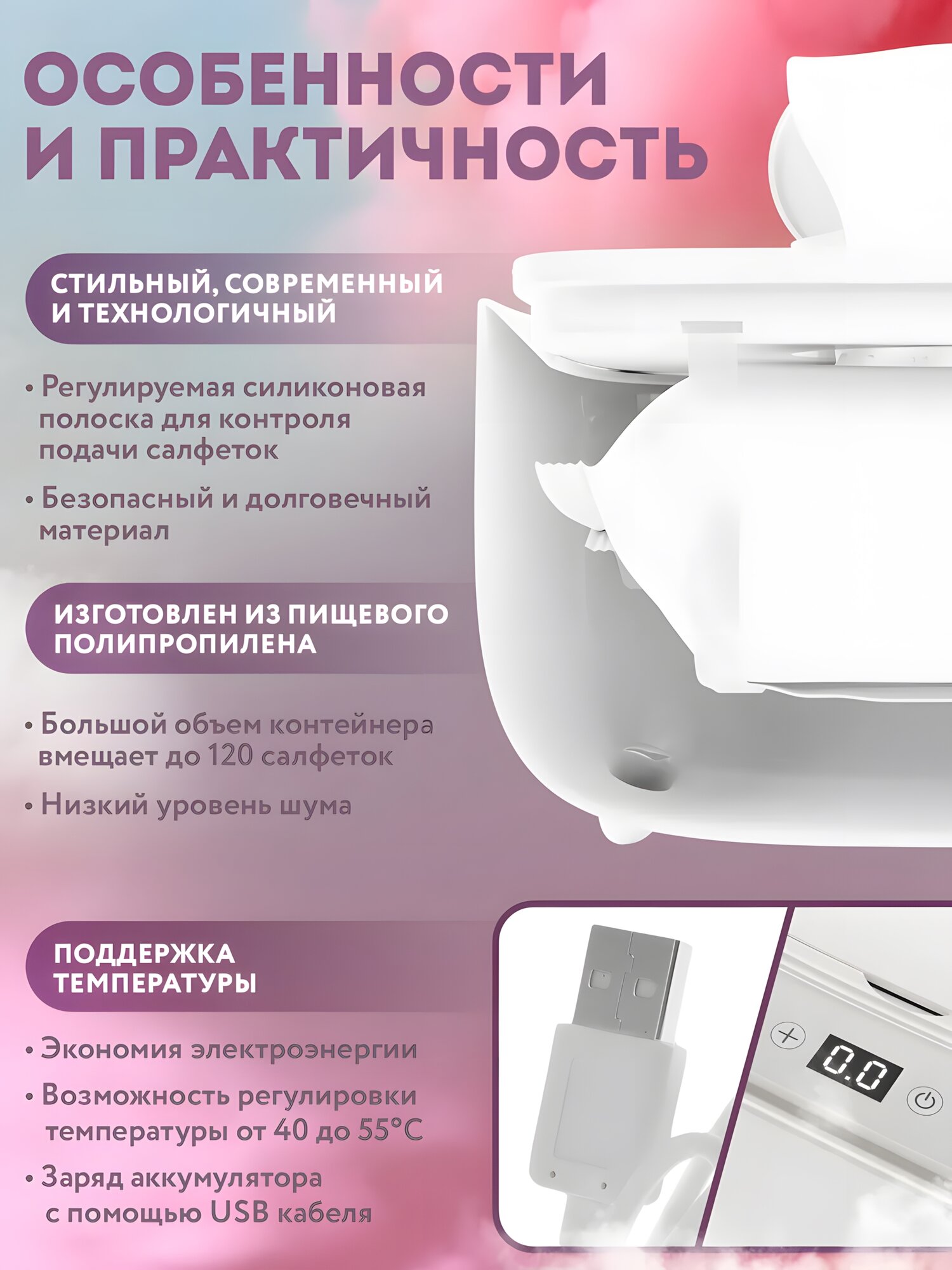 Портативный нагреватель детских салфеток сохраняет влажные салфетки всегда теплыми и свежими. Такой набор для ухода за новорожденным незаменим в каждом доме. Проверенный временем подогреватель для салфеток, органайзер для хранения станет незаменимым устройством в вашем доме. стильный. Контейнер для влажных салфеток usb подогреватель — самый лучший помощник для молодых родителей, который гарантирует безопасный уход за новорожденным. Эргономичный дизайн диспенсера для салфеток отлично впишется в любой интерьер дома. высокое качество. • Органайзер для хранения салфеток выполнен из пищевого полипропилена высокого качества. • Прочный материал контейнера для хранения влажных салфеток делает диспенсер для салфеток долговечным. • Емкость для салфеток не источает запаха пластика при нагревании. • Подогреватель для влажных салфеток вмещает марки абсолютно любых салфеток до 120 штук. бесшумный. Салфетница для влажных салфеток не побеспокоит вашего ребенка, пока он спит. скорость нагрева. Для влажных салфеток контейнер – это быстрое время нагрева в течение 10-15 минут не заставит долго ждать. Мощность - 8 Вт, нагреватель сохраняет заданную температуру в течение 36 часов. хранение. Конструкция держателя для влажных салфеток с подогревом искусно удерживает салфетки в верхней части бокса наиболее теплыми, а инновационное силиконовое уплотнение помогает удерживать влагу, предотвращает высыхание и затемнение влажных салфеток в диспенсере.