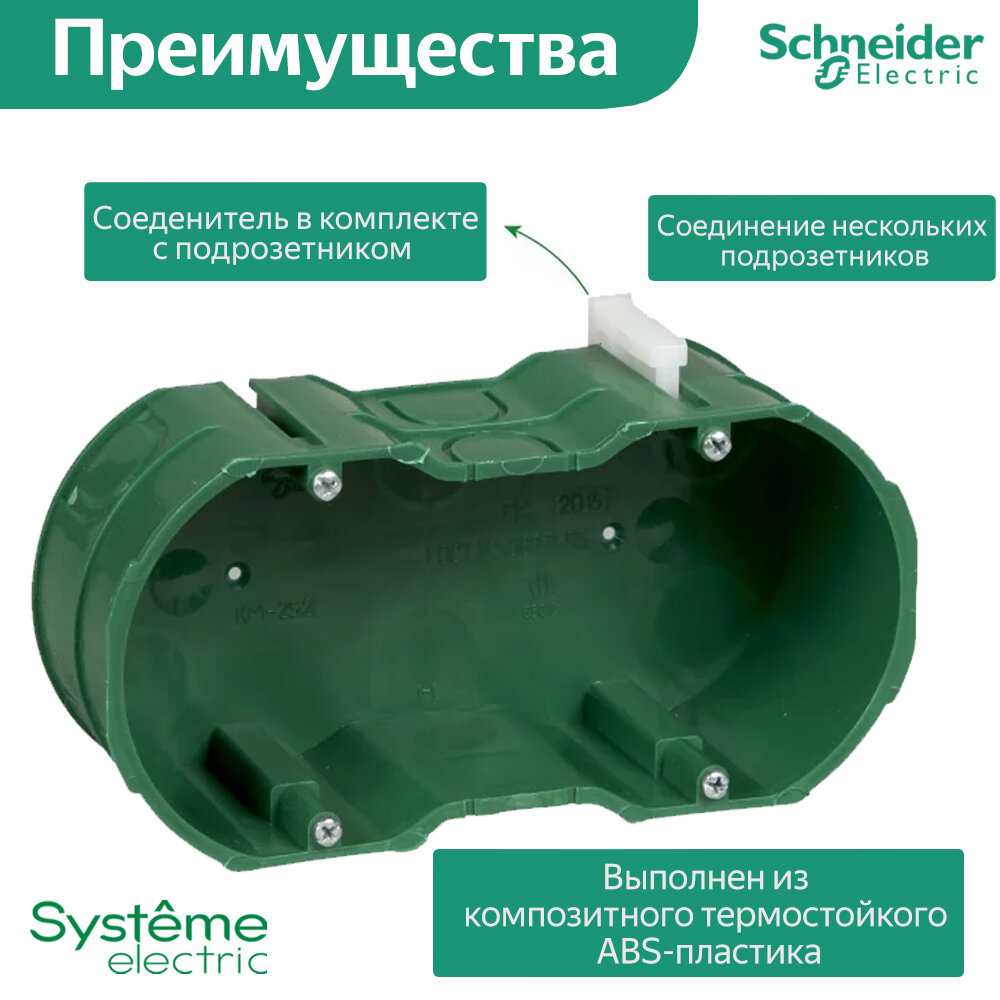 Установочная коробка Schneider Electric скрытой проводки двойная KM-252 на 2 поста выполнена в зеленом цвете. Применяется для надежной установки и фиксации электроустановочного изделия.