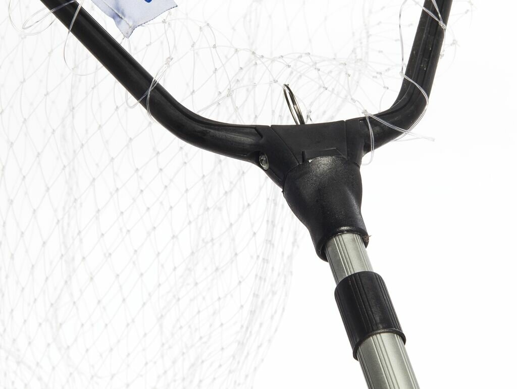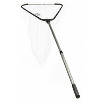 Складной подсачек с треугольной формой сачка с сеткой из лески и с телескопической рукояткой.