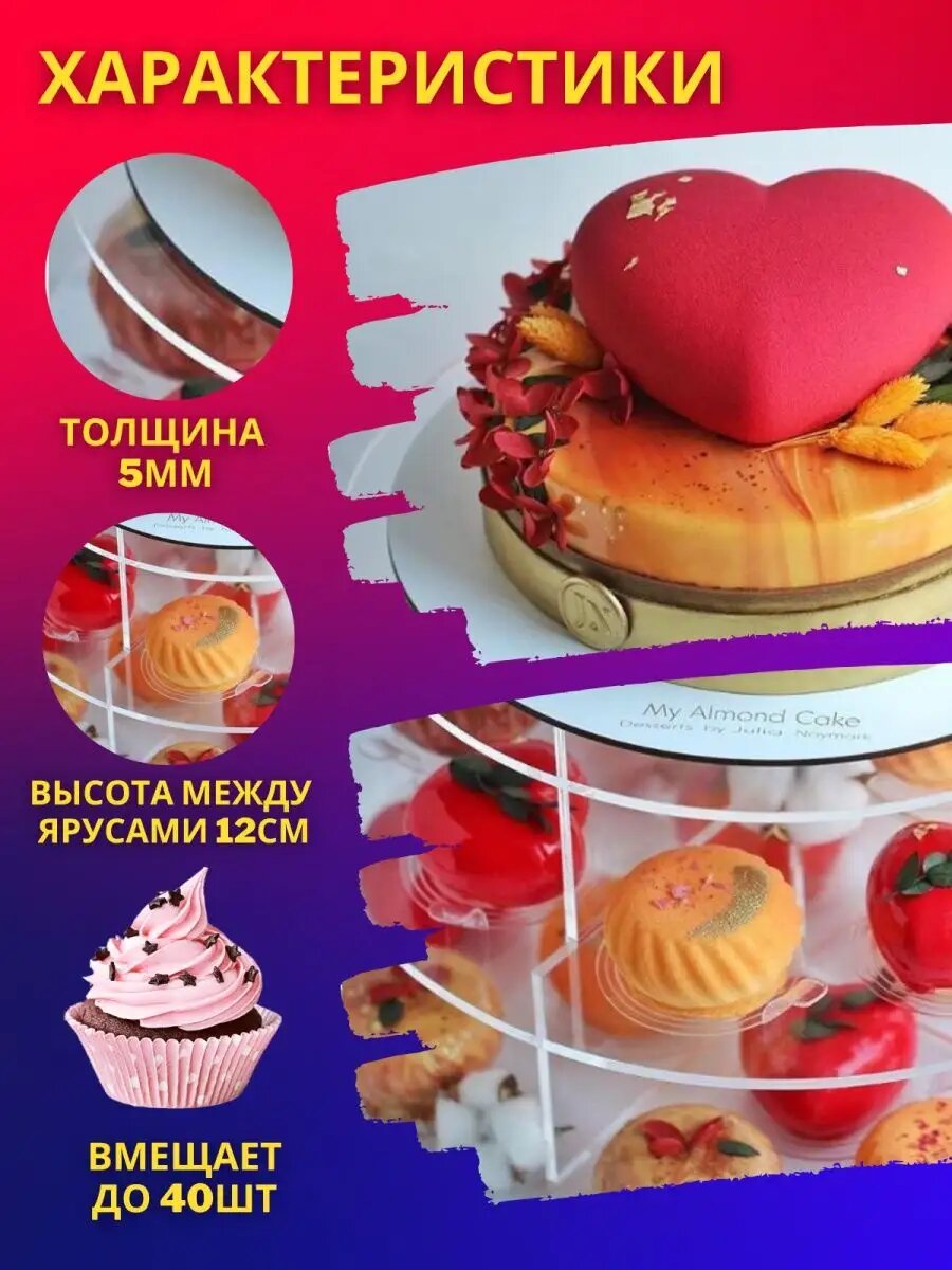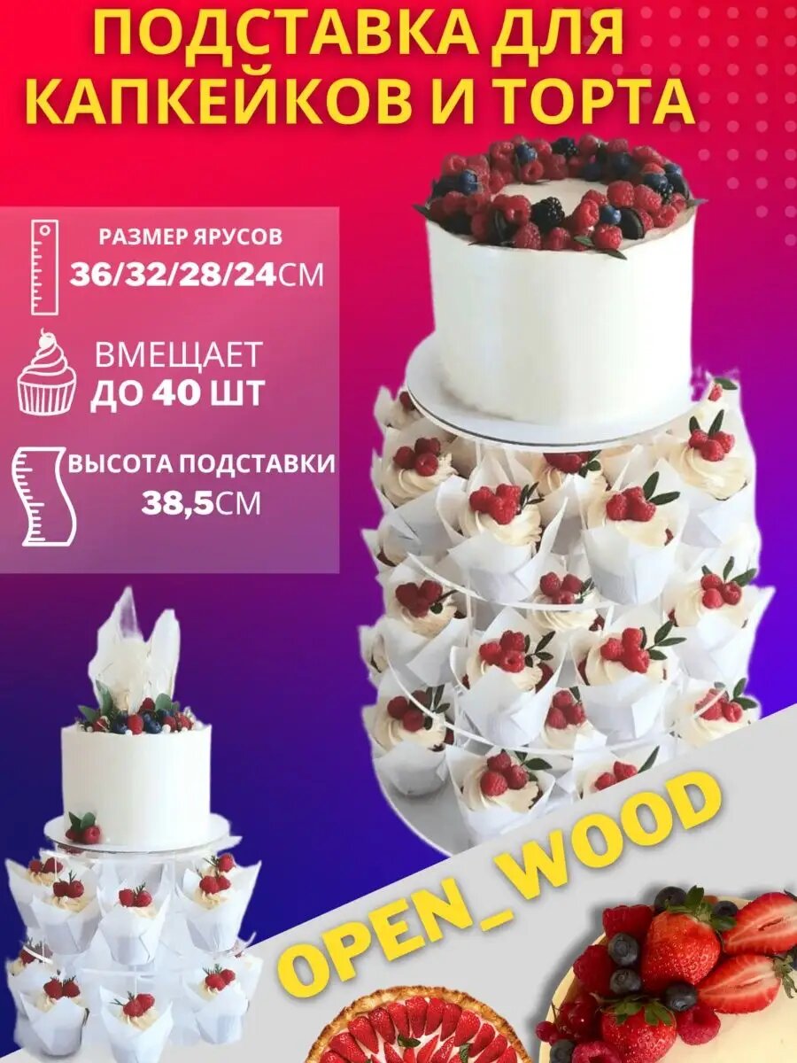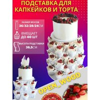 Подставка имеет четыре яруса, которые можно разобрать для удобной транспортировки или хранения. Благодаря своей износостойкости и высокой надежности, она выдерживает вес до 15 кг, что позволяет безопасно разместить на ней не только 40 капкейков, но и торт. Высота всей подставки составляет 38 см, а высота между ярусами – 12 см. Эти параметры делают ее идеальным выбором для праздников как с большим количеством гостей, так и для уютных вечеринок в узком кругу людей.