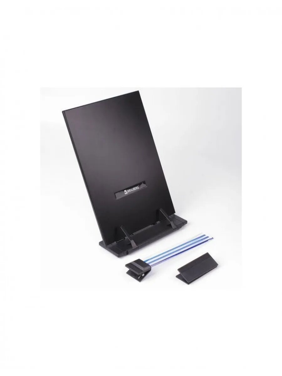 Характеристики: - Назначение: для книг, учебников, журналов и планшетов - Регулируемый угол наклона: да - Держатель для страниц: верхний и нижний - Линейка для работы с текстом: да - Материал корпуса: металл и пластик - Цвет: черный - Размеры: высота 30.5 см, ширина 21.2 см - Упаковка: картонная коробка - Бренд: BRAUBERG - Производитель: Китай