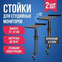 Профессиональные стойки для колонок, акустических систем, студийных мониторов. Подставка для колонок изготовлена из стали и имеет складную конструкцию, что позволяет легко их брать с собой на выступления и концерты. Продается в комплекте из 2шт. Монтаж акустики производится путем крепления к столу. Крепление Grommet для столешниц шириной до 6.3см. Нескользящие накладки защищают стол от царапин, хорошо фиксируют зажимы. Кронштейн для колонок регулируется по высоте: от 31 до 47 см, что позволяет подобрать оптимальное расположение для вашей hi-fi аппаратуры или для домашнего кинотеатра, для концертных и клубных колонок. Фиксирующий штифт - это дополнительная защита от случайного опускания стойки. Имеется 4 уровня высоты: 31см, 36см, 41,5см, 47см. Размер платформы: 24смх32см. Основание имеет прорезиненные накладки и бортик ограничитель. Подставки отлично подойдут для дома, студии танцев, студии звукозаписи и других помещений. Максимальная нагрузка: 30 кг. Регулировка угла наклона от - 15 до + 15 градусов.