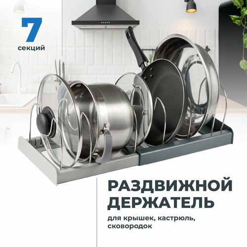 Подставка для крышек кастрюль - это многофункциональная и универсальная система хранения кухонной утвари. Держатель для крышек от кастрюль поможет сохранить порядок на Вашей кухне при этим экономя свободное пространство и обеспечивая легкий доступ к ним. Подставка на кухню подходит для большинства видов кухонного инвентаря: сковород, крышек, кастрюль, разделочных досок, тарелок, форм для выпечки и другой посуды нестандартной формы. Кроме хранения подставку можно использовать как сушилку для посуды на столе. Разместить подставку для сковородок можно в шкафу, на полке или в ящике. Органайзер для кастрюли имеет регулируемую длину, он легко подстраивается под ваши размеры, что позволит использовать его на любых полках и выдвижных ящиках на кухне. Металлические вставки со специальной выемкой для крышек и сковородок обеспечат удобное расположение принадлежностей на полочке. Органайзер выполнен из прочного и качественного ABS-пластика, а регулируемые вставки из металла, что обеспечит долгий срок службы. Раздвижная конструкция не требует усилий в сборке, количество и размер секций регулируются под необходимую посуду. Минималистичный и эргономичный дизайн позволит идеально вписаться разделителю в любой интерьер кухни. Длина регулируется от 30,5 до 56 см, ширина органайзера в кухонных шкаф - 20.4 см. В комплектацию входит подставка и 7 держателей для крышек и кухонных приборов. Организуйте порядок и компактное размещение посуды на своей кухне вместе с универсальной подставкой от бренда Shiny Kitchen!