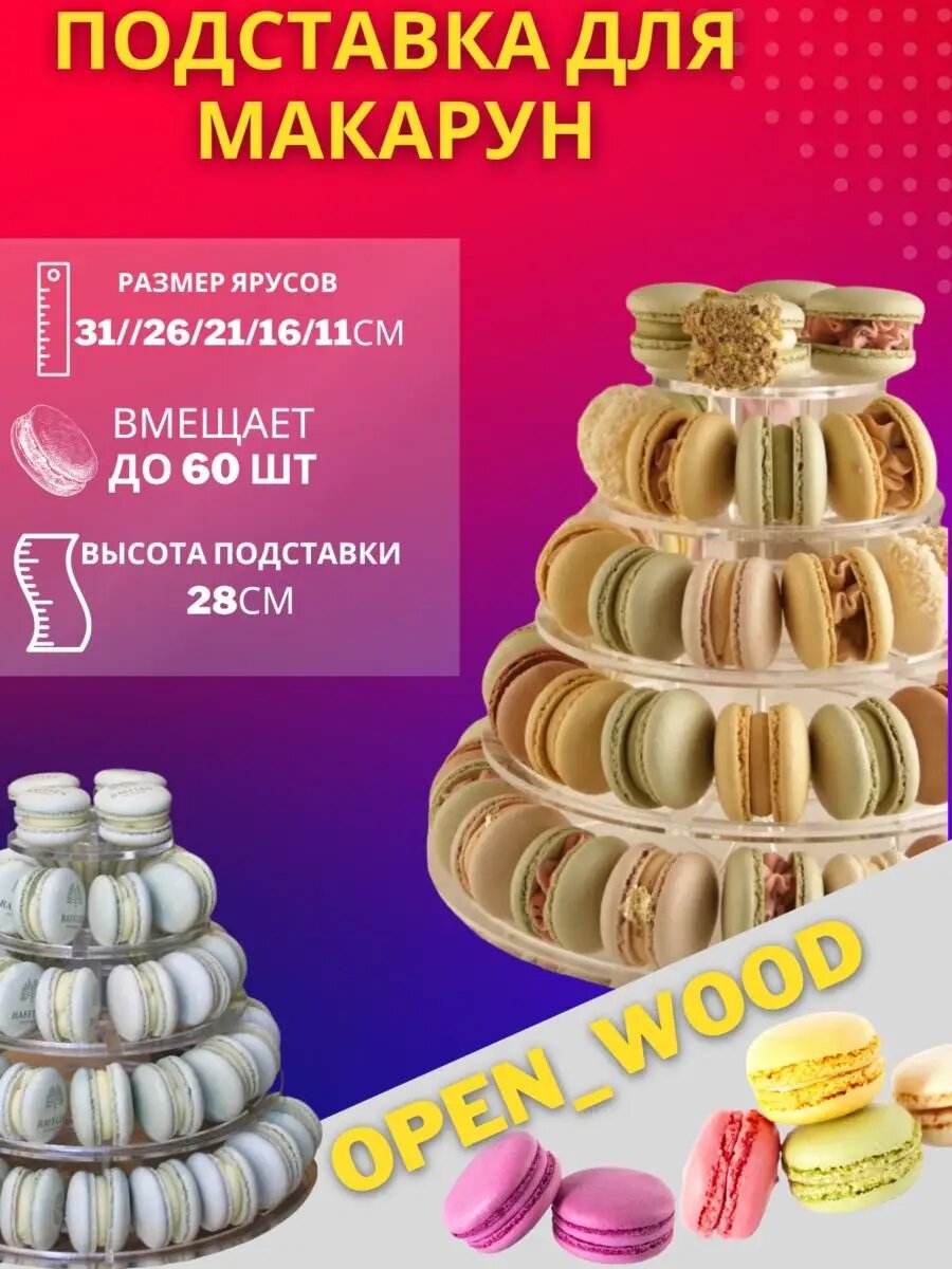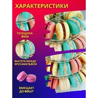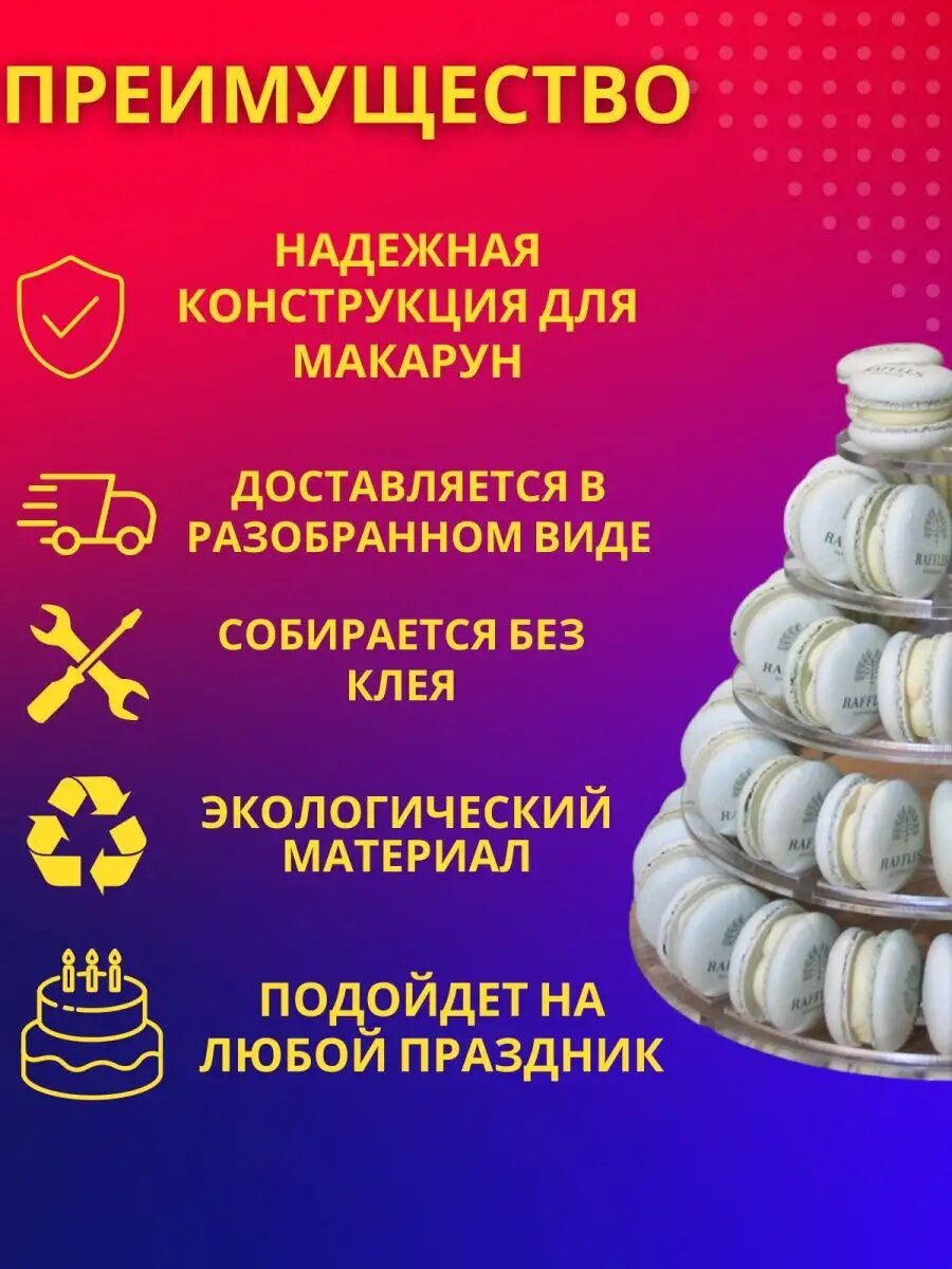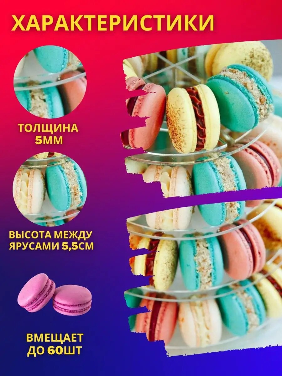 Горка для макарун сделана из прозрачного акрила толщиной 5мм: Почему вам следует ее купить ! С фиксирующим кольцом надежно крепит подставку Полностью разборная и сделана из 5мм акрила Абсолютно прозрачная! Подставка вмещает в себя до 60 макарун. Выдерживает вес до 12кг Ярусы вращающиеся, если с одной стороны закончились макарун можно повернуть другой стороной подойдет для: День Рождения Свадьба Новый Год Гендер Пати(gender reveal party) Юбилей Крестины Выписка из Роддома Выездная регистрация Новоселье Расстояние между ярусами 5,5см