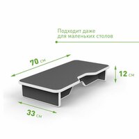 Преимущества: Эргономика — приподнимает монитор, снижая нагрузку на шею и глаза. Универсальность — подходит для широкоформатных мониторов и компактной акустики. Практичность — пространство под подставкой удобно использовать для клавиатуры, периферии, мобильных устройств или личных вещей. Индивидуальный стиль — выбор цвета из нескольких вариантов массива и канта. Качество — изготовлена из прочного ЛДСП 16 мм и окантована ПВХ, что обеспечивает устойчивость и защиту стола от царапин.
