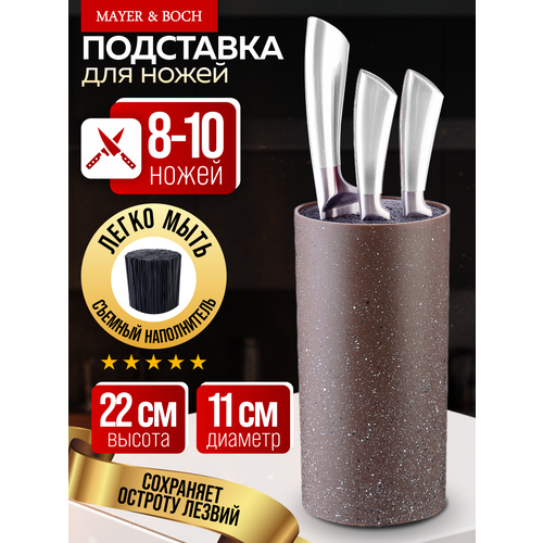 Универсальная круглая подставка для ножей MAYER & BOCH — это практичное и стильное решение для вашей кухни. Она поможет вам упорядочить хранение всех необходимых кухонных принадлежностей в одном месте. Подставки изготовлен из прочного пищевого пластика, который обеспечивает её долговечность и гигиеничность. Кроме того, он покрыт нескользящим слоем soft-touch коричневого цвета, что делает использование подставки ещё более комфортным. Особенность этой подставки — внутренний наполнитель из тонких и гибких полипропиленовых стержней. Они очень прочные, легко моются и не требуют особого ухода. При необходимости их можно свободно вынуть и помыть в посудомоечной машине. Полипропилен — экологически чистый материал, устойчивый к истиранию, высоким температурам и химическому воздействию. Полипропиленовый наполнитель надёжно удерживает ножи на месте, предотвращая их скольжение и повреждение острых лезвий. Благодаря этому вы сможете бережно хранить набор ножей и быстро найти нужный инструмент во время готовки. Органайзер подходит для металлических и керамических ножей, а также для хранения ножниц. Эта подставка станет не только удобным аксессуаром для вашей кухни, но и полезным подарком для вас и ваших близких. Поставляется в надёжной упаковке. Порадуйте себя и своих близких качественным и полезным подарком — держателем для ножей MAYER&BOCH!