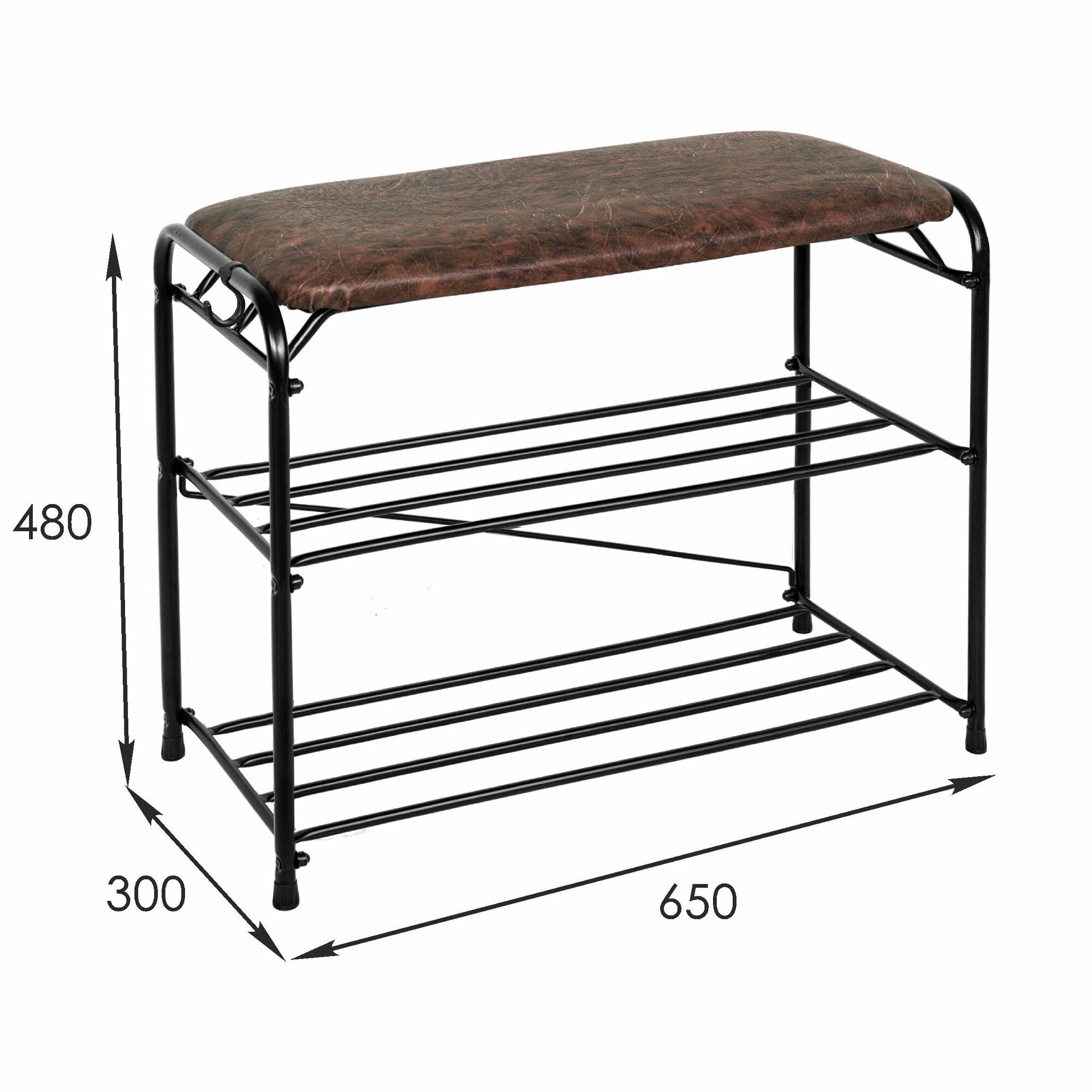 материал сиденья: ДСП 10 мм; поролон, винилискожа; материал каркаса: нержавеющая сталь; пластиковые заглушки; полимерно-порошковое покрытие; разборная конструкция; расстояние между полками 140 и 215 мм; крючок для мелочей; допустимая нагрузка на сиденье до 120 кг; допустимая нагрузка на полку до 8 кг