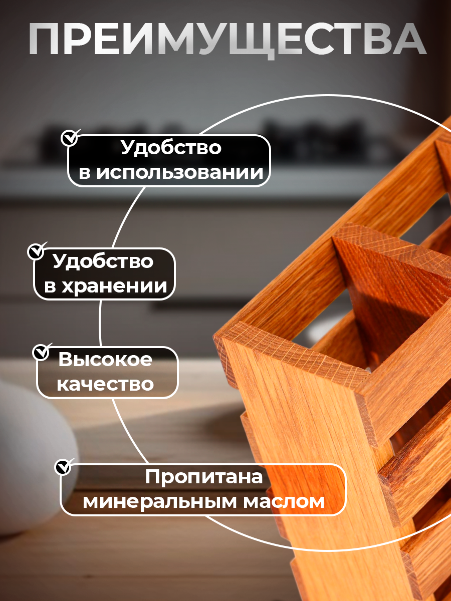Деревянная подставка лоток для столовых приборов впечатлит вас своей универсальностью и станет украшением декора. Вместительный органайзер выполнен из полностью натурального материала -дуба. Кухонный аксессуар устойчив к царапинам, менажница стоит на столе и будет долго вас радовать своим видом. Не рекомендуем использовать как сушилку и мыть в посудомойке. Не рекомендуется мыть ее универсальными моющими средствами и мылом, достаточно протирать слегка влажной салфеткой. Деревянная декоративная подставка впишется практически в любой интерьер, и будет прочнее чем пластиковый или стеклянный органайзер.