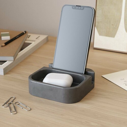 Подставка для телефона Oliver, 10.5х10.5х3 см - удобный аксессуар, изготовленный вручную из декоративного бетона по специальной технологии. Подставку можно использовать в качестве держателя для смартфона или планшета. Также имеется отделение для хранения беспроводных наушников, разных канцелярских принадлежностей (например, скрепок) и прочих мелочей. Минималистичный дизайн позволит подставке для телефона идеально вписаться в любой интерьер, привнося в него частичку скандинавской эстетики. Изделие обработано специальным двухкомпонентным глянцевым лаком, надёжно защищающим текстуру от воды и появления разводов. Для защиты поверхностей в комплекте прилагаются фетровые и силиконовые накладки. Размеры: Длина: 10,5 см | Ширина: 10,5 см | Высота: 3 см Вес: 0,4 кг Интерьерные изделия из бетона - это невероятная долговечность, при аккуратном обращении покупка будет служить десятилетиями и со временем будет становиться только прочнее. Благодаря широкому выбору цветов и универсальности материала изделие впишется в любой интерьер от ультрасовременного до классического. Мы влюблены в наш продукт. Мы вкладываем душу в наши изделия. Каждое из них продумывается до мелочей и проходит тщательный контроль качества. Бетон был выбран нами не случайно. Этот потрясающий натуральный материал способен принимать любую форму и, благодаря особенностям производства, каждая новая партия имеет собственный уникальный оттенок, фактуру, структуру пор и характер. Создавайте свой неповторимый интерьер и атмосферу с предметами от MUSKO HOME!