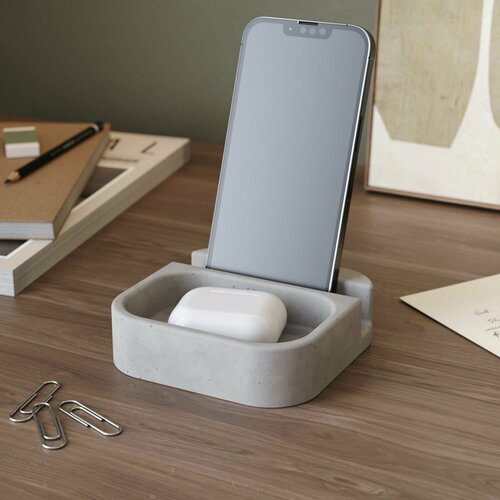 Подставка для телефона Oliver, 10.5х10.5х3 см - удобный аксессуар, изготовленный вручную из декоративного бетона по специальной технологии. Подставку можно использовать в качестве держателя для смартфона или планшета. Также имеется отделение для хранения беспроводных наушников, разных канцелярских принадлежностей (например, скрепок) и прочих мелочей. Минималистичный дизайн позволит подставке для телефона идеально вписаться в любой интерьер, привнося в него частичку скандинавской эстетики. Изделие обработано специальным двухкомпонентным матовым лаком, надёжно защищающим текстуру от воды и появления разводов. Для защиты поверхностей в комплекте прилагаются фетровые и силиконовые накладки. Размеры: Длина: 10,5 см | Ширина: 10,5 см | Высота: 3 см Вес: 0,4 кг Интерьерные изделия из бетона - это невероятная долговечность, при аккуратном обращении покупка будет служить десятилетиями и со временем будет становиться только прочнее. Благодаря широкому выбору цветов и универсальности материала изделие впишется в любой интерьер от ультрасовременного до классического. Мы влюблены в наш продукт. Мы вкладываем душу в наши изделия. Каждое из них продумывается до мелочей и проходит тщательный контроль качества. Бетон был выбран нами не случайно. Этот потрясающий натуральный материал способен принимать любую форму и, благодаря особенностям производства, каждая новая партия имеет собственный уникальный оттенок, фактуру, структуру пор и характер. Создавайте свой неповторимый интерьер и атмосферу с предметами от MUSKO HOME!