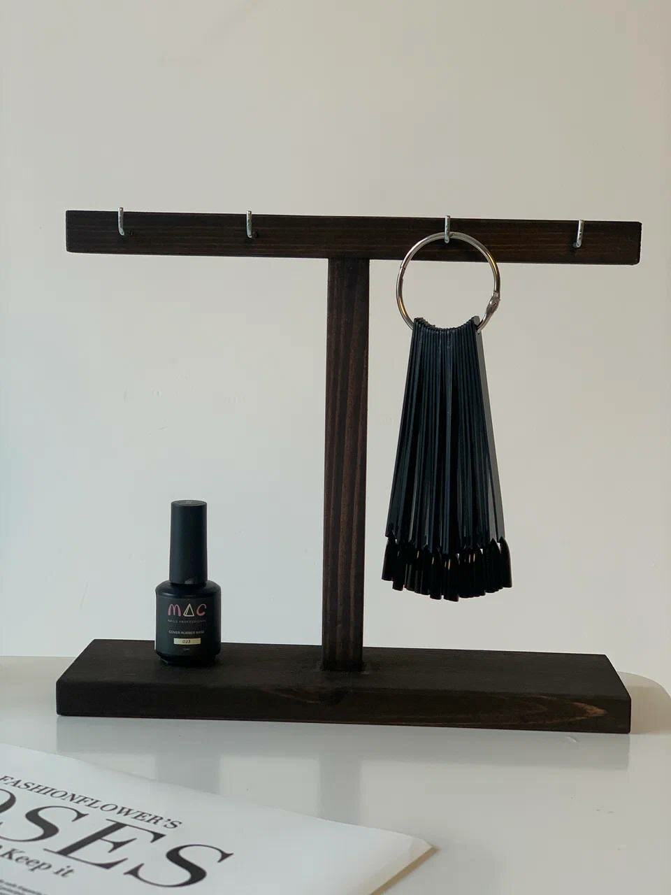 Новый подарочный набор для маникюра и педикюра - это профессиональный инструментарий и удобная подставка для работы дома или в салоне. Органайзер настольный поможет убрать по местам такие маникюрные принадлежности, как кольца с палитрой типс, и сделает рабочую зону еще более стильной. Маленькая настольная вешалка ручной работы, выполненная из натурального дерева и имеющая 6 штук металлических крючков, подходит для организации хранения декоративных украшений и прекрасно смотрится на большом комоде или прикроватной тумбочке. Изделие доставляется в готовом виде - сборка не требуется. Такие полезные предметы просто идеальны для создания уютного интерьера дома или в рабочем кабинете маникюрного и педикюрного мастера. С подставкой вам будет легче демонстрировать яркие цвета лаков для покрытия, образцы готовых дизайнов и типсы вашим клиентам. Разнообразие форм и материалов позволит выбрать подходящий под каждый случай. Вы сможете разместить на этом держателе все необходимое подвесное оборудование для обработки и дизайна ногтевых пластин и накладных ноготков. Красивая упаковка делает этот набор идеальным подарком для любой возрастной категории - от начинающих мастеров и девочек - подростков до профессиональных маникюрщиц в салонах красоты. Этот аксессуар имеет эстетичный внешний вид и обеспечивает уютный интерьер в гостиной или спальне. Компактный дизайн, возможность хранить накладные ногти и демонстрировать форму среза ноготочков делают этот предмет универсальным и необычным средством. Вы можете приобрести его как подарок на праздник или годовщину, День рождения дорогой и любимой подруге, сестре, маме или коллеге по работе. Подходит для клиентов домашнего салона или профессионального мастера. Компактный держатель с металлическими вешалками и деревянной стойкой имеет небольшой вес и красивый цвет. Это идеальный женский подарок, обеспечивающий уютный интерьер и хранение всех маникюрных принадлежностей. Такие интересные, оригинальные и практичные вещи обязательно понравятся и взрослой женщине, и молодой девушке. Товары нашего магазина порадуют вас отменным качеством и эстетичным внешним видом!