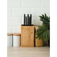 Подставка деревянная для ножей и кухонных принадлежностей - универсальное решение для хранения. Практичный и стильный аксессуар для кухни украсит любой интерьер. Держатель для столовых приборов станет отличным решением для экономии места, благодаря ему ваши ножи и кухонные принадлежности будут всегда под рукой. Хранение ножей в универсальном держателе позволит избежать затупления лезвий, порчи рукояток, а также обезопасит вас от порезов. Деревянная подставка из натурального бамбука для ножниц на стол имеет приятный внешней вид. Прочные, но гибкие прорези подставки будут надежно фиксировать ножи. Альтернатива магнитному держателю для ножей. подойдет к другим предметам интерьера и аксессуарам для кухни. Размер 22.5*10.5*14 см. Цвет натуральное дерево.