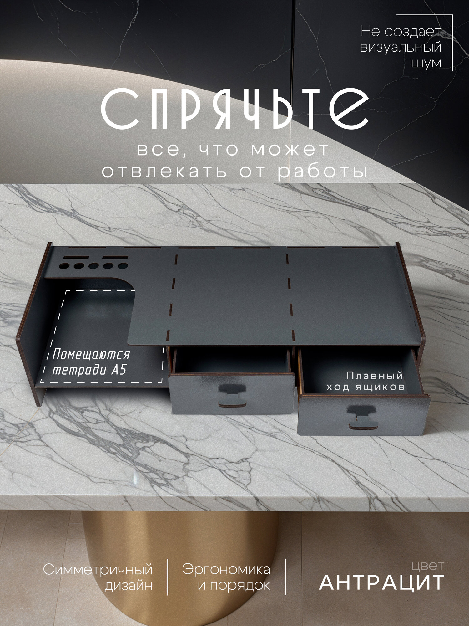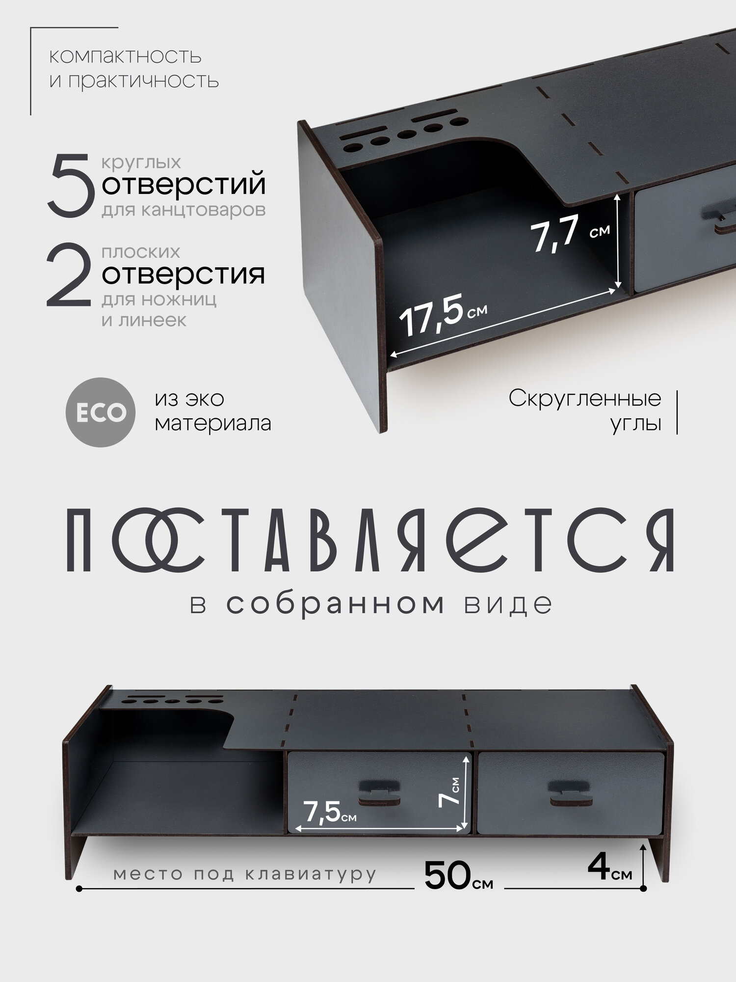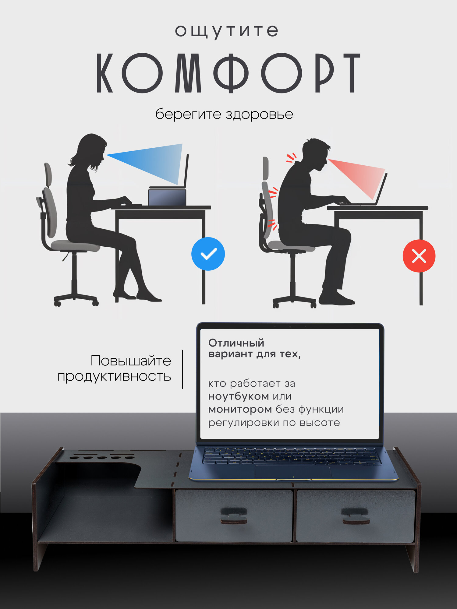 Наша подставка под монитор компьютера не только обеспечивает оптимальную высоту экрана для комфортной работы, но и предлагает удобное хранение благодаря встроенным ящикам.