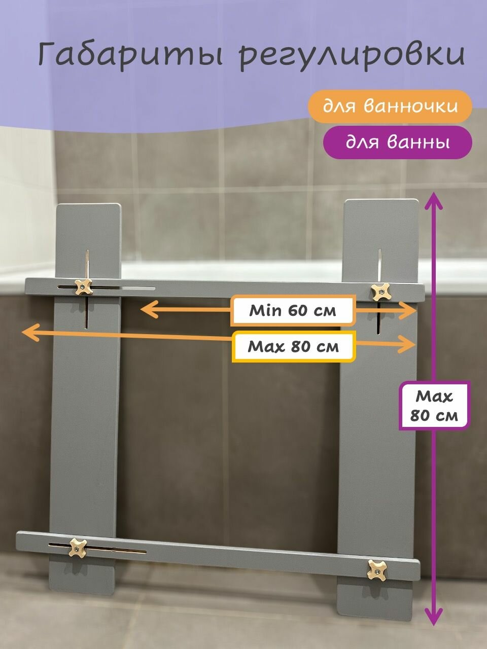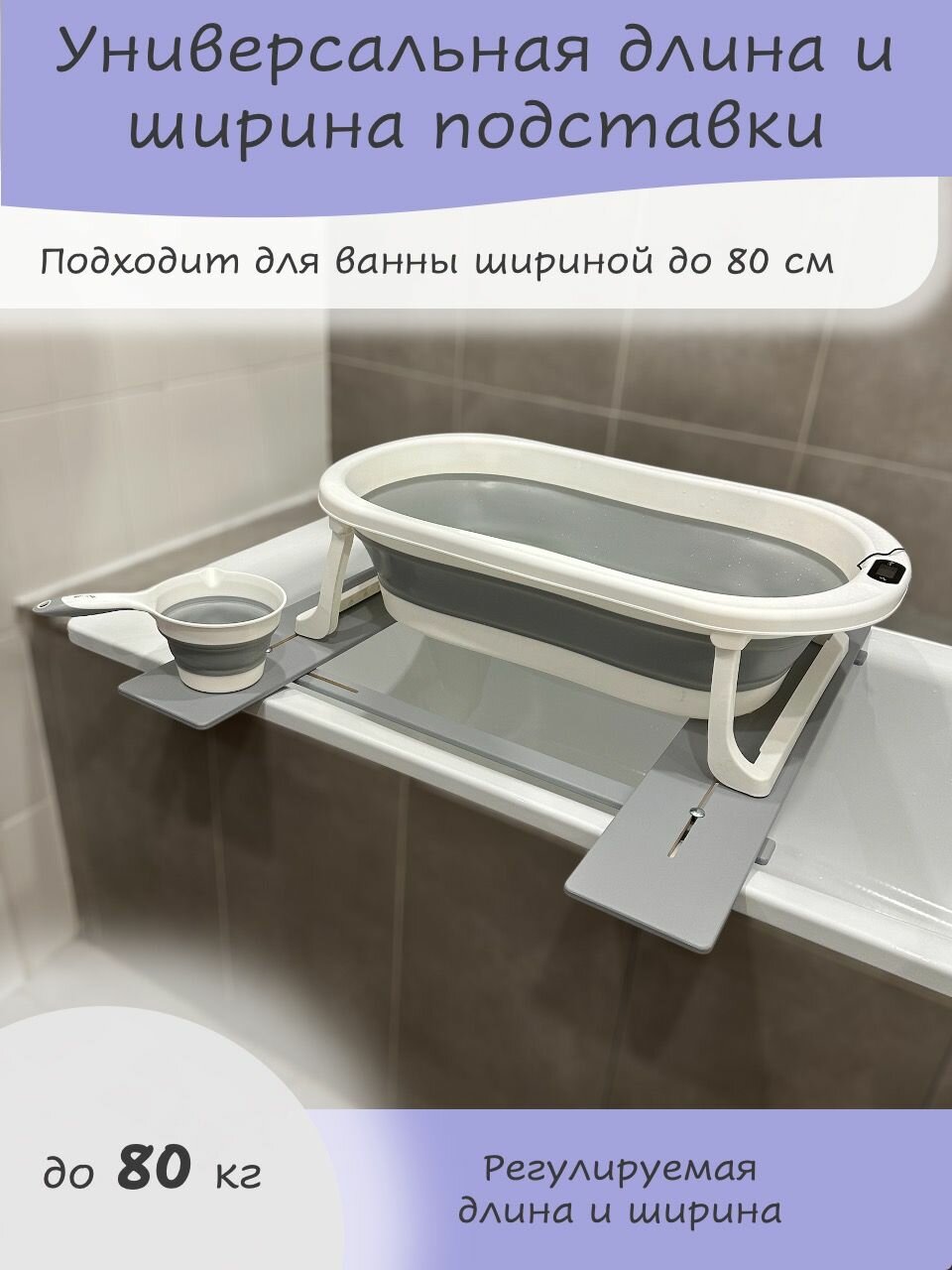 Универсальная подставка для детской ванночки - это удобный и практичный аксессуар, разработанный для удобного размещения ванночки на ванне. Конструкция подставки идеально подходит для ванночек различных размеров, а регулируемая длинна и ширина позволят вам подобрать оптимальный уровень для комфортного купания, избавляя вас от необходимости наклоняться и напрягать спину. Складные ванночки необходимо эксплуатировать на ровной поверхности, чтобы избежать повреждения ножек. Подставка под ванночку подходит для ванн с шириной до 80 см от бортика до бортика по внешнему краю. Деревянная подставка под детскую ванночку имеет прочную и надежную конструкцию, выдерживающую нагрузку до 80 кг. Деревянная решетка на ванну изготовлена из высококачественного экологически чистого дерева с масляным покрытием. После использования подставка легко складывается, экономя место в ванной комнате. Эта подставка для ванночки – это не просто удобство, но и забота о вашем малыше. Её натуральные материалы не вызывают аллергии и раздражения, а прочная конструкция гарантирует безопасность во время купания. Сделайте купание вашего крохи ещё более приятным и комфортным с нашей универсальной подставкой для ванночки! Она станет незаменимым помощником в уходе за вашим малышом, подарив вам спокойствие и уверенность Внимание! Перед эксплуатацией убедитесь в правильной сборке изделия (инструкция прилагается). Никогда не оставляйте малыша без присмотра во время купания!