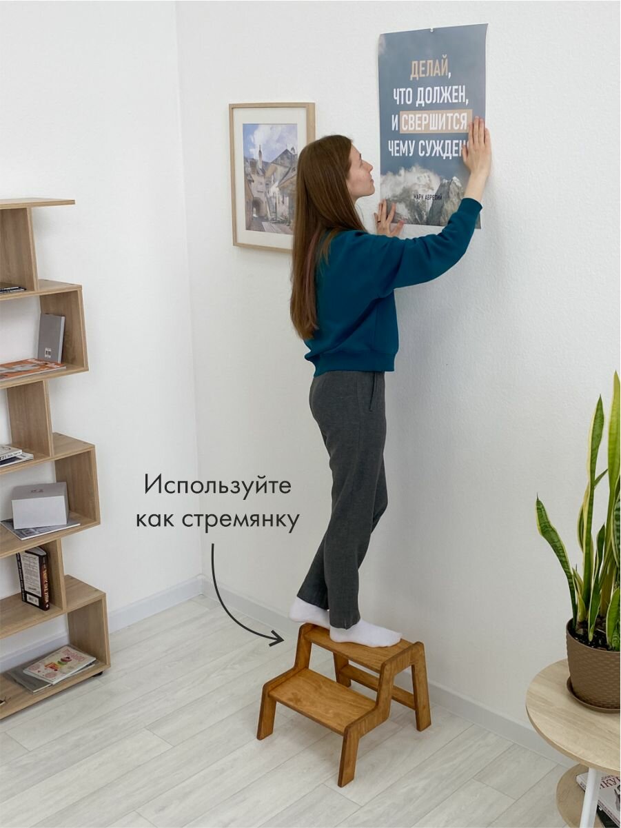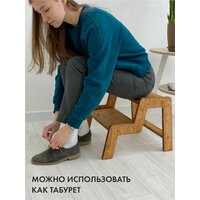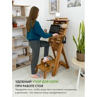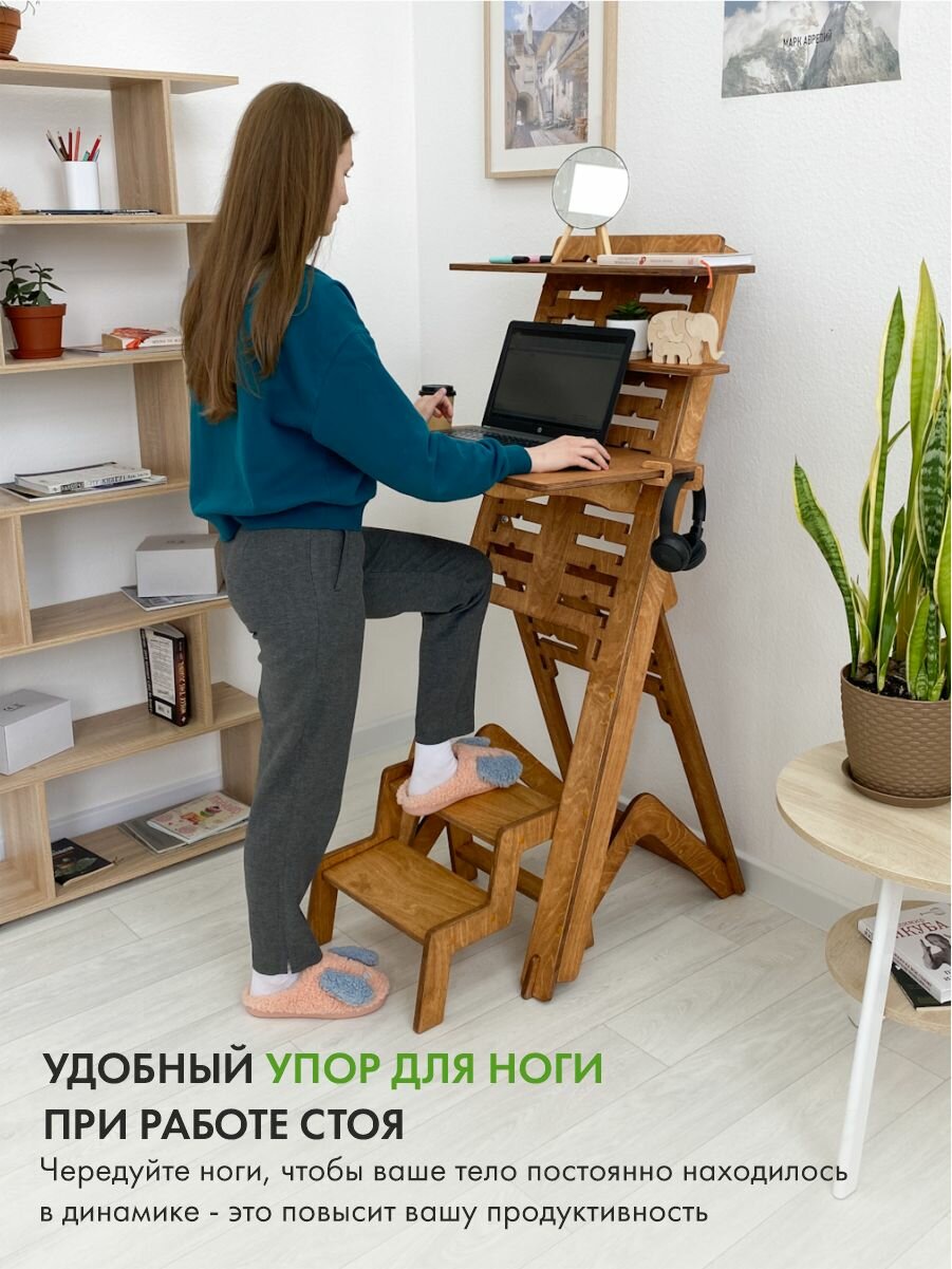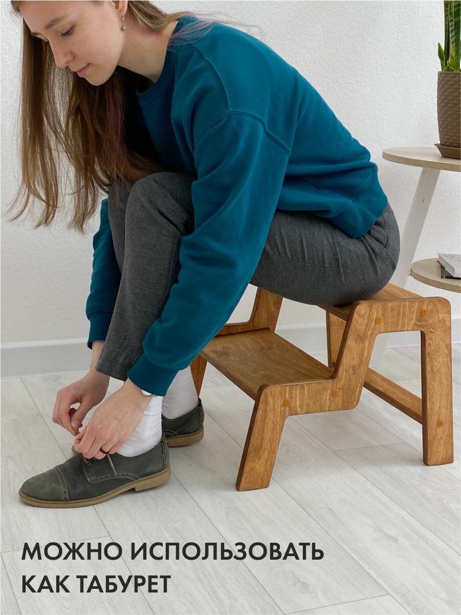 Мы создали подставку под ноги для вашего удобства в работе и повседневной жизни. Используйте как лесенку-стремянку для того, чтобы дотянуться до верхних полок, или упор для ноги при работе стоя. Благодаря наклону ступени в 5 градусов, ваша стопа чувствует себя комфортно. Чередуйте ноги, чтобы ваше тело постоянно находилось в движении - это повысит вашу продуктивность и снизит утомляемость. Подставка изготовлена из натуральной березовой фанеры экстра-класса 18 мм. Детали тщательно отшлифованы, без зацепок и острых углов. Покрыта натуральным мебельным маслом с воском – подставка полностью защищена от загрязнений и влаги. Выдерживает вес до 150 кг.