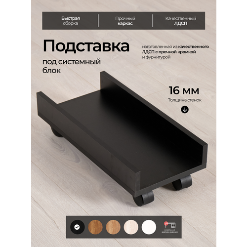 Идеальное решение для организации рабочего пространства – аксессуар, который облегчает работу за компьютером и помогает рационально использовать место. Этот предмет подходит для офисного стола и домашнего использования, создавая комфортные условия. Аксессуары для компьютерного стола незаменимы для упорядочивания устройств, особенно если требуется разместить компьютерный процессор или другой блок в удобном месте. Конструкция создана с учетом потребностей владельцев компьютерной техники. Полка позволяет разместить технику под столом или сделать ее частью офисной мебели. Также возможно использование как дополнительный аксессуар на рабочий стол. Мобильность конструкции достигается благодаря наличию колесиков, что делает перемещение легким даже на ограниченном пространстве. Это особенно удобно для офисного рабочего места, где важна эргономика и свободное передвижение элементов мебели. Такой вариант подойдет для установки процессора или другого устройства не только дома, но и в офисе. Для обеспечения безопасности устройство имеет прочную конструкцию из материалов высокого качества - ЛДСП 16 мм. Оно минимизирует контакт техники с поверхностью пола и способствует улучшению вентиляции за счет открытого доступа воздуха к оборудованию.