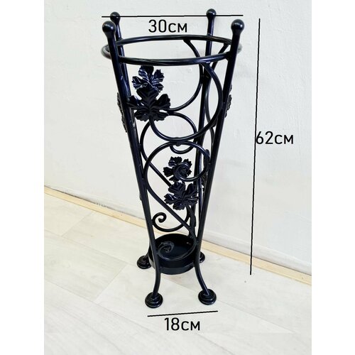Изделие изготовлено из цельного стального металла высокого качества. Размеры: высота 62 см, диаметр 25 см сверху и 12,5 снизу. Покраска изделия производится в специальной порошковой камере, что обеспечивает высокое качество поверхности. Кованые зонтницы имеют помимо практической еще и реальную декоративную функцию, находят свое место в прихожей, на кухне и даже в гостиной. В нашем каталоге Вы увидите множество моделей, здесь вы найдете ту, которая украсит ваш интерьер и удовлетворит ваши желания в декоре дополнит оформление вашего помещения и придаст элегантность вашей гостиной. Они используется не только для хранения и сушки зонтов, но также будет украшением вашей прихожей — дополнит полный комплект кованой мебели. Подставки под зонтики должны быть в первую очередь функциональными и служить своей цели.