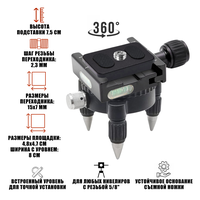- Размеры штативной площадки: длина: 4,8 см, ширина: 4,7 см, ширина с уровнем: 8 см; ширина крепления в паз: 4-4,5 см