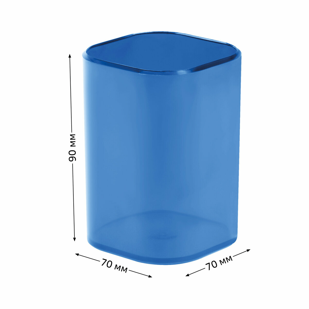 Подставка-стакан СТАММ предназначена для хранения канцелярских принадлежностей. Удобная квадратная форма, классический дизайн. Подставка размером 90*70*70 мм изготовлена из качественного полистирола. Цвет изделия - тонированный синий.