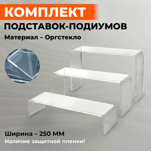 Универсальные подставки-подиумы из прозрачного оргстекла толщиной 4 мм для демонстрации товара, комплект 3 штуки. Размеры (ширина, глубина, высота): 1. 25x7x15 см 2. 25x7x10 см 3. 25x7x5 см