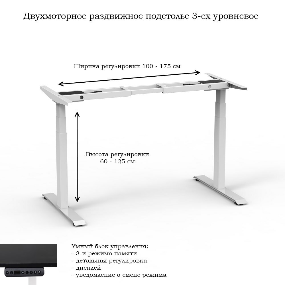 Особенностью данного подстолья является его двухмоторная система раздвижения. Это позволяет легко и быстро настроить высоту подстолья в диапазоне от 60 до 125 см, а ширина регулируется от 100 до 175 см.