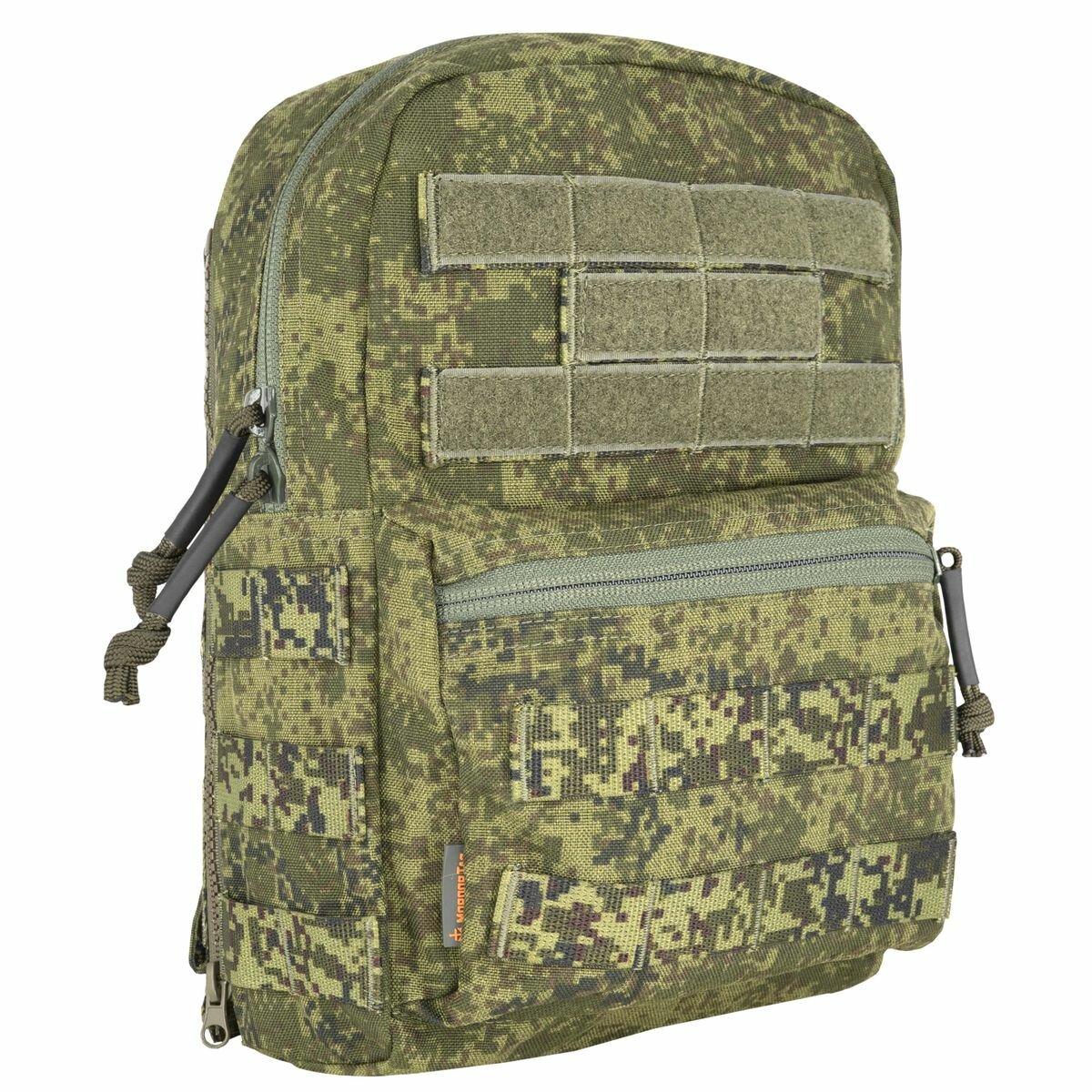 Подсумок имеет объём 6.5 литров и два отделения, закрывающиеся на молнию YKK. Основное отделение имеет большой объем и карман из несущей сетки с защищенным окном для вывода шланга гидратора или проводов. Второе отделение является утилитаркой, внутри которой можно расположить аккумуляторные батареи для радиостанции или другие принадлежности.