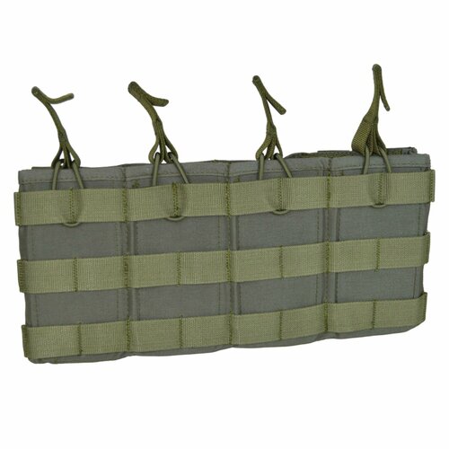Подсумок под 4 магазина АК. На снаряжении занимает 8 стандартных ячеек молле. Фиксация магазина происходит с помощью эластичного шнура с флажком, которым удобно пользоваться даже в зимних перчатках. При необходимости подсумок можно устанавливать не только на молле основу, но и на ремни, сделав из строп петли нужного размера. На дне расположены отверстия с люверсами для слива воды. Высота 14,5 см, ширина 30 см, глубина 3 см. Вес: около 350 грамм.