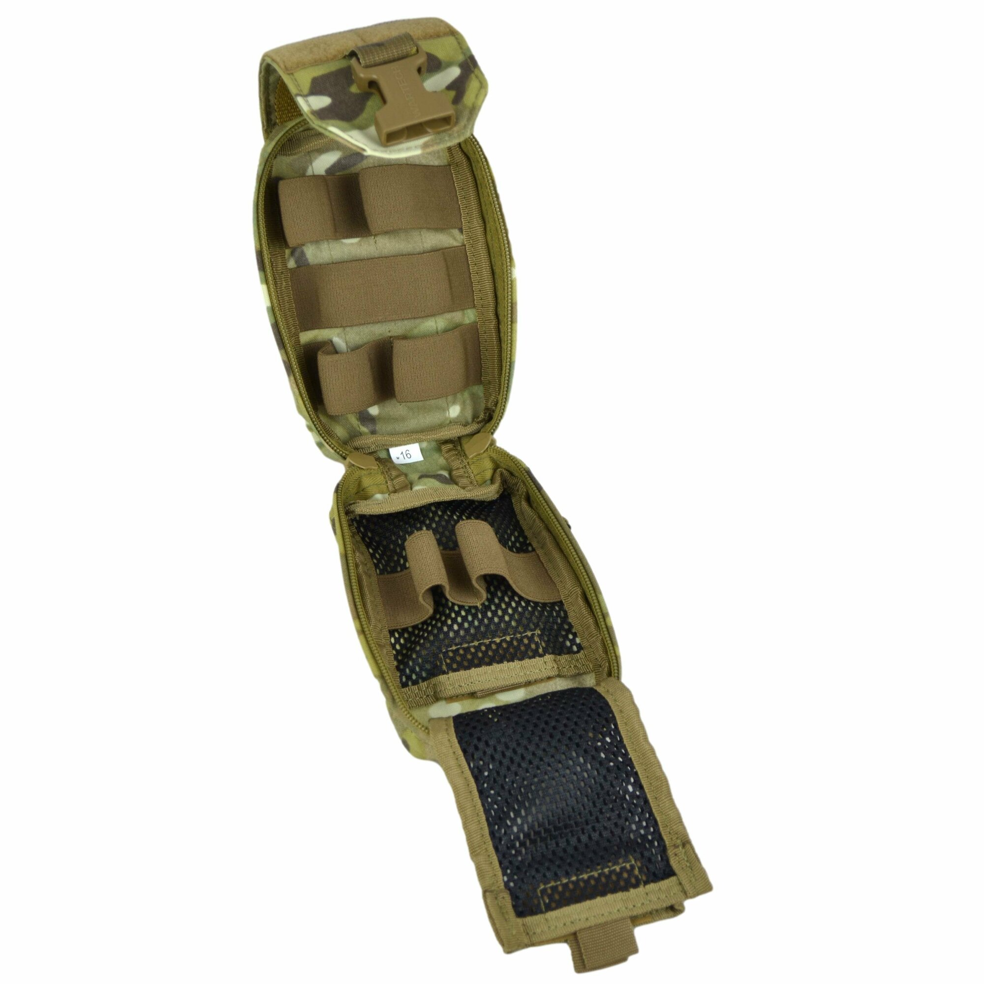 Подсумок медицинский отрывной малый UP-106 предназначен для размещения индивидуальной аптечки с необходимыми компонентами на бронежилете, разгрузочном жилете или поясе, имеющих систему крепления MOLLE. Имеет более компактный, по сравнению с UP-103, размер. Объем позволяет разместить самые важные препараты и инструменты, такие как: ножницы EMT, CAT турникет, CELOX, Израильский ИПП (или сходный по размеру), комплект обезболивающее + антишок со шприцами в футляре. Подсумок можно использовать как утилитарный. Оснащен удобным внутренним органайзером. Закрывается на молнию. Отсек открывается полностью и дает полный доступ к содержимому аптечки. За счет отстегивания подсумка от платформы, к нему можно получить максимально удобный доступ. Возможно размещение на обычном ремне. Габариты подсумка Ш-Г-В (см): 9,5-5-16,5.