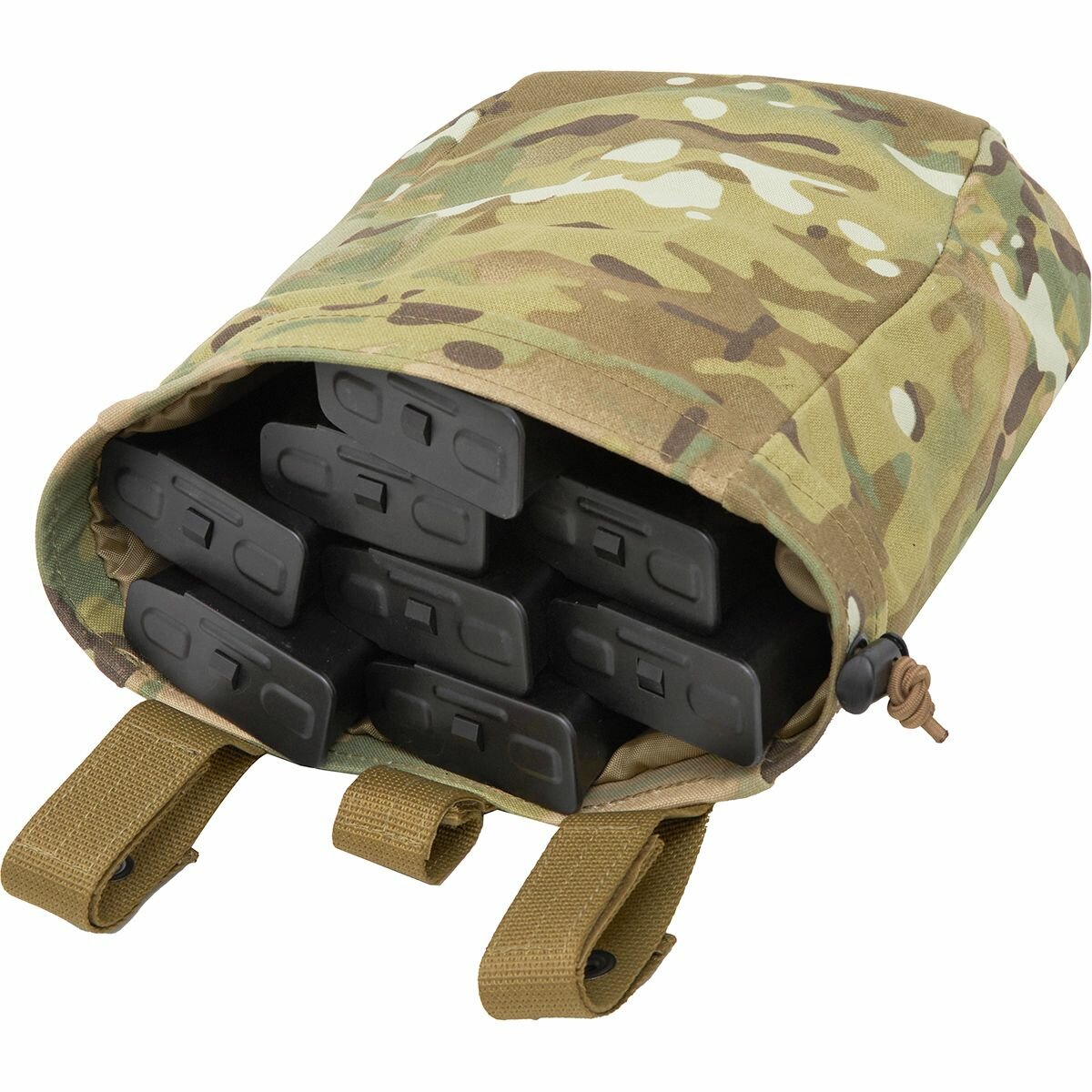 Большой подсумок под сброс пустых магазинов или гильз. В транспортном состоянии подсумок компактен: складывается и фиксируется стропой на липучке. Для использования подсумок разворачивается, без труда вмещает до 8 магазинов серии АК. Пластик, вшитый в горловину подсумка, держит его всегда немного приоткрытым для удобства сброса "вслепую". Горловину подсумка можно стянуть кулиской с фиксатором, если подсумок полон. В нижней части есть люверсы для отведения попавшей внутрь воды. Подсумок можно закрепить как на MOLLE, так и на обычном брючном ремне шириной до 80 мм. Материал изготовления – нейлон. Габариты подсумка Ш-Г-В (см): 23-11-26. Магазины, представленные на фото, показаны исключительно с целью демонстрации возможностей изделия. В комплект поставки не входят.