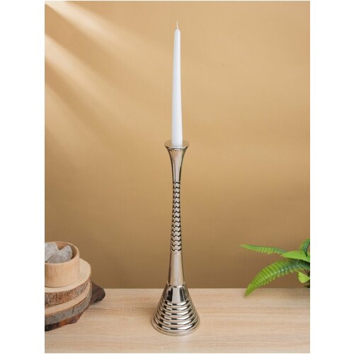 Набор: Нет Цвет: Хромированный Высота, см: 41 Количество рожков: 1 Диаметр под свечу, см: 2 Тематика праздника: Универсальная тематика Материал: Алюминий Свеча в комплекте: Нет Состав: Алюминий Размеры товара: 10/41/10