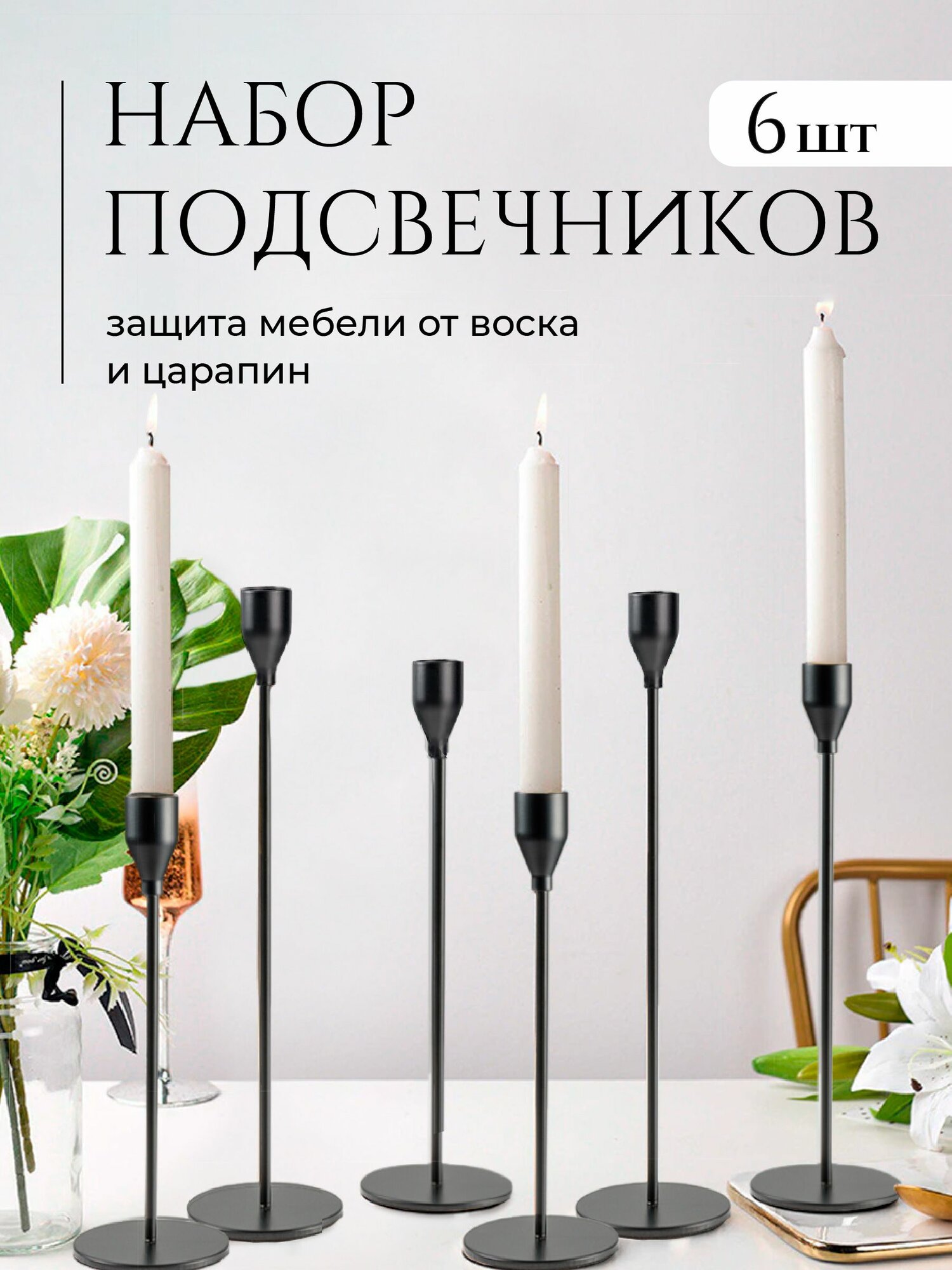 Металлические подсвечники — это стильные и элегантные детали, которые дополнят интерьер вашего дома. Новогодние подставки для высокой свечи освещают жилище и создают уют, особую романтическую атмосферу. Набор подсвечников на ножках изготовлены из высококачественной нержавеющей стали черного цвета, достаточно прочны и не деформируются при падении, легко очищаются от воска и других загрязнений, не ржавеют и не царапают поверхность. Благодаря современному дизайну подставки под свечи из металла впишутся в любое интерьерное решение. Декоративный подсвечник станет прекрасным выбором для создания романтической, уютной и праздничной атмосферы в доме. Металлическую подставку под свечу используют в гостиной, спальне, на кухне и даже в ванной. Универсальная подставка прекрасно выполняет функции: новогоднего украшения, свадебных и рождественских подставок под свечи. В комплекте 6 штук. Набор подставок станет отличным украшением и подарком себе и близким на день рождения, Новый год, Рождество, новоселье и т. д. Черный подсвечник – это безупречный стиль и качество.