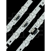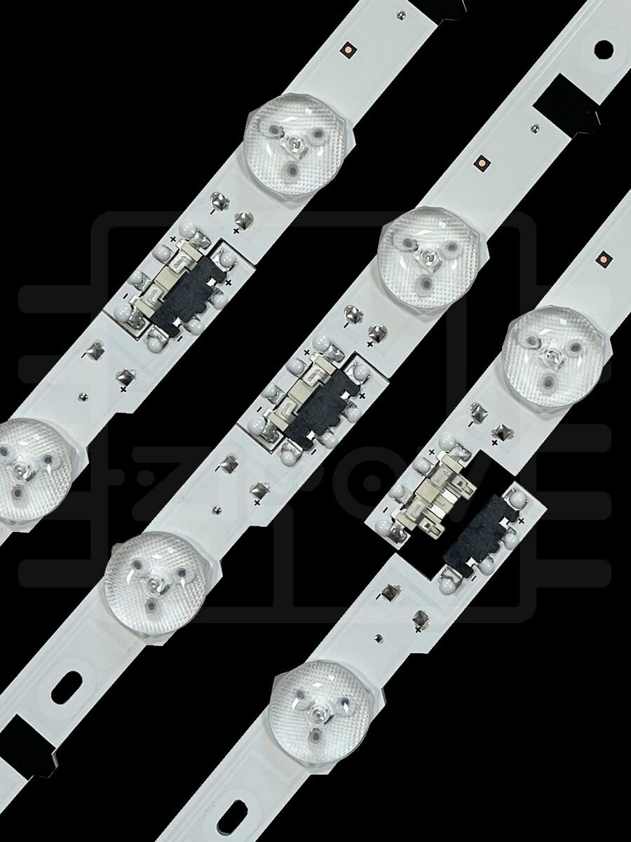 Комплект состоит из 7-ми линеек по 8 диодов и 7-ми линеек по 5 диодов. Всего 91 диод в комплекте. Комплект предназначен для замены всей подсветки на одном ТВ.
