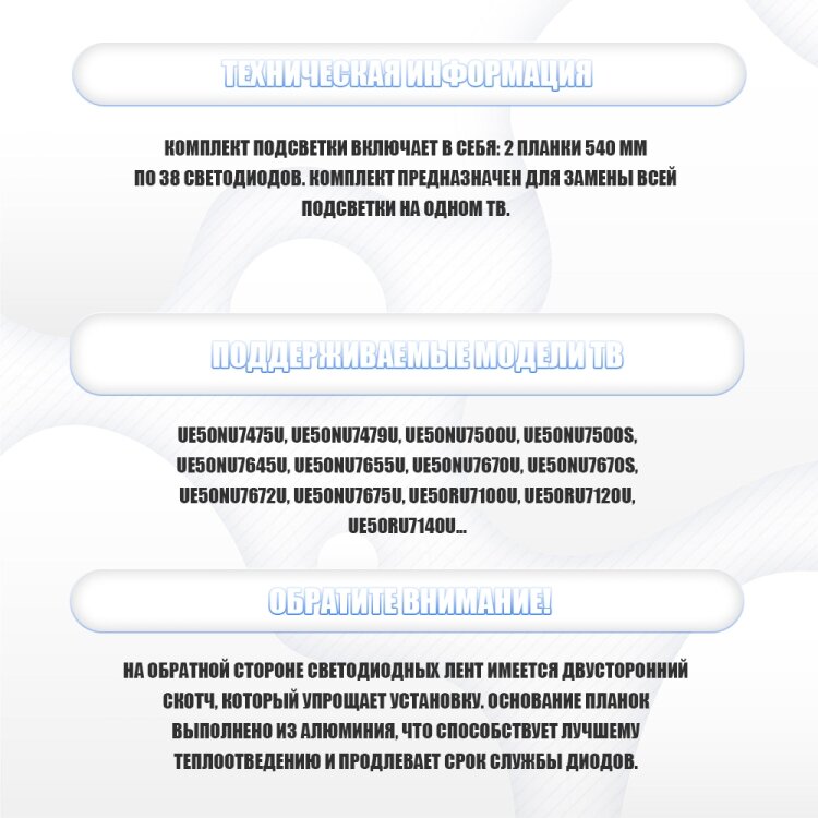 Перед покупкой сверьте модель телевизора, количество линз, разъем подключения, напряжение диодов. Обязательно обращайте внимание на версию подсветки! В одинаковых моделях устанавливают до 4х разных типов! Магазин Профдетали предлагает широкий ассортимент качественных запчастей для электроники: от бытовых приборов до компьютерной техники. Мы гарантируем, что наши детали отличаются высоким качеством, что обеспечивает надежность и долговечность ваших устройств. Помните, что установка запчастей должна производиться квалифицированными специалистами, так как это является залогом успешного ремонта и долгого срока службы вашей техники. Доверьтесь профессионалам для монтажа, чтобы избежать возможных ошибок и дополнительных затрат.