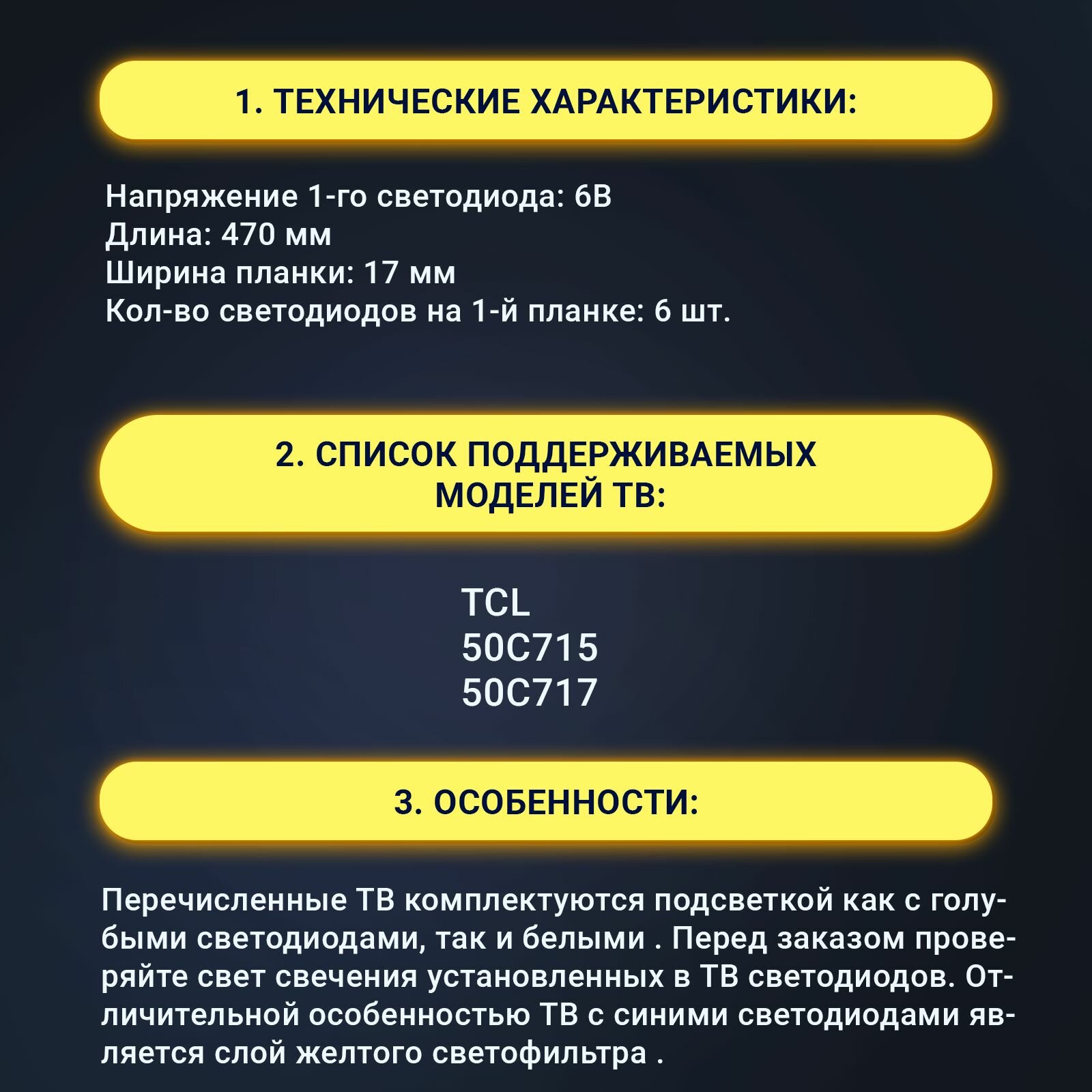 Внимание: Цвет свечения синий. В перечисленных ТВ встречаются 2 варианта: Синий светодиод с желтым светофильтром и белый светодиод. Устанавливается в ТВ: TCL 50C715 TCL 50C717 ТСЛ 50С715 ТСЛ 50С717 Маркировка: TCL-50C715-3030FC-6X2-B-LX20200309 THE-4C-LB5006-YH13J 241220-400B0-31346 TCL 50CF16 50D6BCZ47017B Технические характеристики: Длина: 470мм Напряжение 1-го светодиода: 6 V Материал основания: алюминий Цвет светодиода: Синий Состав комплекта: 8 планок с 1-м коннектором, 2 планки с 2-мя коннекторами.
