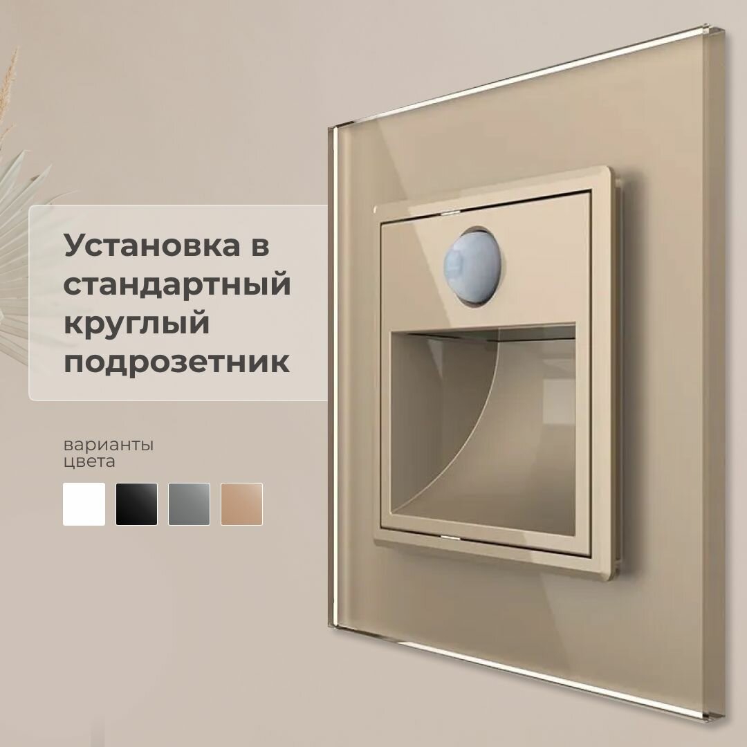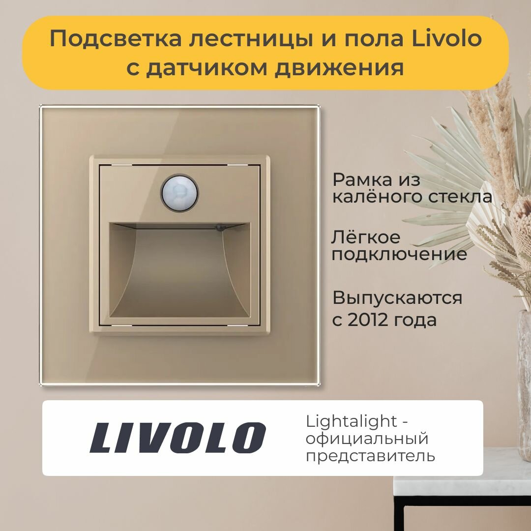Подсветка лестницы и пола Livolo светит слабым мягким светом. Мощность светодиода 0.35Ватт. Датчик реагирует на движение и включается только в тёмное время суток. Время работы после срабатывания 40 секунд. Устанавливается в круглые подрозетники с рамками Livolo для розеток. Рамка из калёного стекла.