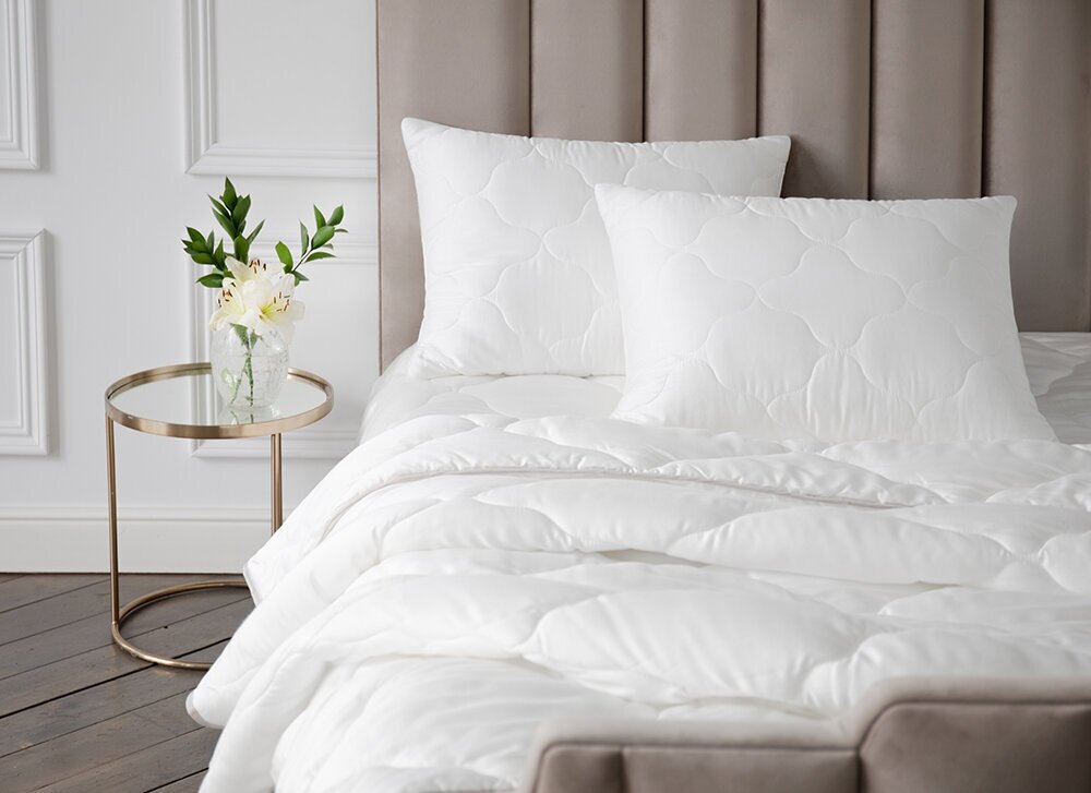 Для наполнения стеганого чехла использовано натуральное шелковое волокно из нитей кокона тутового шелкопряда. Натуральный шелк - дорогой природный материал, который идеально подходит для наполнения спальных принадлежностей благодаря своим природным качествам. Легкий и очень мягкий шелк хорошо пропускает воздух, не вызывает аллергических реакций, быстро впитывает испарения кожи и обеспечивает оптимальный теплообмен, на подушке комфортно спать в любое время года.