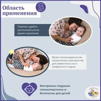 Подушка для беременных и кормящих женщин, форма рогалик (банан). Особенности: Комфорт во время отдыха будущей мамочки. Удобно сидеть или лежать во время сна и отдыха, просмотра телевизора, чтения или работы за компьютером. Незаменимой подушка для будущей мамы становится с начала второго триместра, когда животик начинает активно расти. Подушку можно класть под уставшие ноги, под поясницу, под животик. После рождения малыша подушка пригодится во время кормления как грудного, так и искусственного. Наша подушка выполнена из качественных проверенных материалов, которые рекомендованы для использования в изделиях для беременных и для детей с рождения. Внутренний чехол выполнен из 100 % плотного хлопка и оснащен маленькой молнией 20 см для регулировки плотности наполнителя. С этой дополнительной функцией вы всегда сможете: а) проверить качество наполнителя и убедиться, что мы используем при производстве своих изделий действительно качественные материалыб) убавить часть наполнителя, отрегулировав тем самым ту плотность подушки, при которой вам будет комфортно и удобно. Наволочка на молнии выполнена из нежнейшего 100% хлопка Поплин. Особенности данной ткани: а) Высокая плотность при кажущейся легкостиб) Сохранение теплас) Благодаря специальной обработке нет образования катышковд) Качественный принт, не линяет. Молния на наволочке закрыта дополнительной планкой. Подушку можно использовать как позиционер или ограничитель пространства при совместном сне мамы и малыша. Из подушки легко сделать уютное гнездышко, где малышу будет комфортно и безопасно находиться. Подушка помогает малышам чуть более старшего возраста учиться сидеть. Подушка «банан» одна из самых популярных моделей среди подушек для беременных. За счет не очень большого размера занимает мало места. Удобно стирать, помещается в стиральную машину. Можно брать с собой в поездки. Принимает разные формы, что удобно и во время беременности, и во время кормления малыша. Наполнитель — Комфорель софт. Силиконизированное волокно из 100% полиэстера, которое проходит дополнительную термообработку, за счет чего оно преобразовывается в шарики. Специальная антибактериальная обработка волокон надежно защищает комфорель от плесневелых грибов, бактерий и клещей. Материал сохраняет свои антибактериальные свойства даже после многократной стирки. Пустотелая структура материала позволяет изделиям из комфорели «дышать», а также оставаться всегда сухими и теплыми. Комфорель моментально восстанавливает свою форму после деформации и сохраняет ее долгое время. Внутренний чехол (наперник) 100 % хлопок бязь. Наволочка 100% хлопок поплин. Наполнитель - комфорель софт. Уход: деликатная стирка 40 градусов, не отбеливать, не сушить. После стирки встряхнуть и разложить на ровной поверхности до полного высыхания