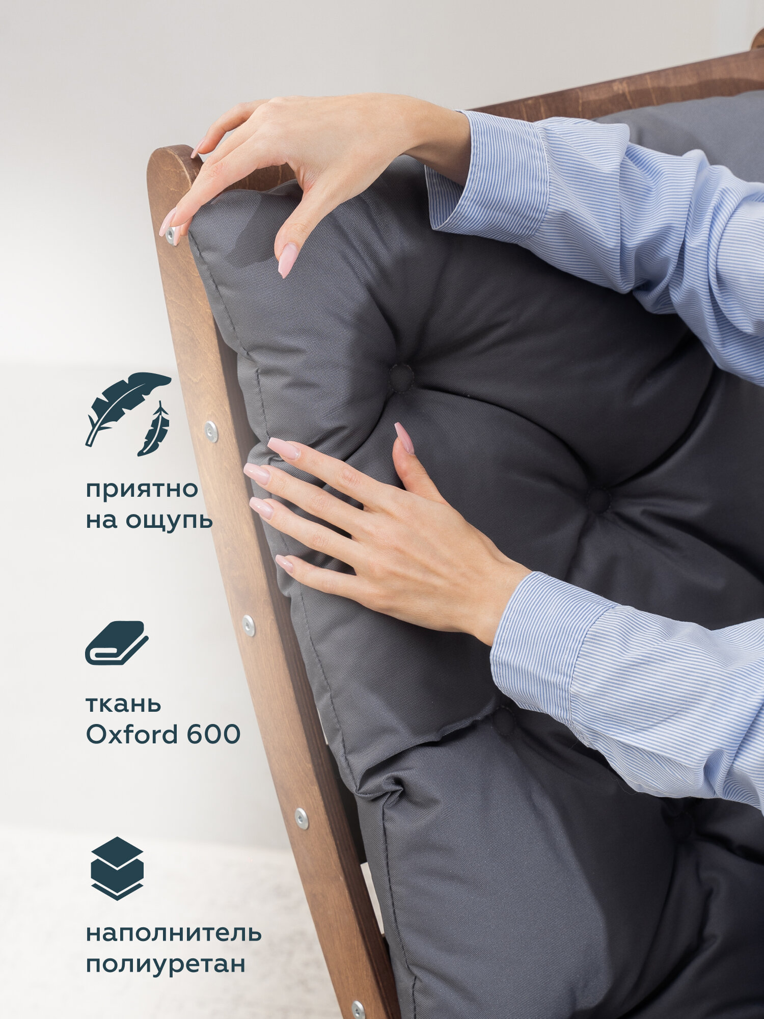 Подушка изготовлена из водостойкой ткани "Оксфорд", что гарантирует долговечность и устойчивость к влаге. Наполнитель из синтепона обеспечивает мягкость и комфорт при использовании.