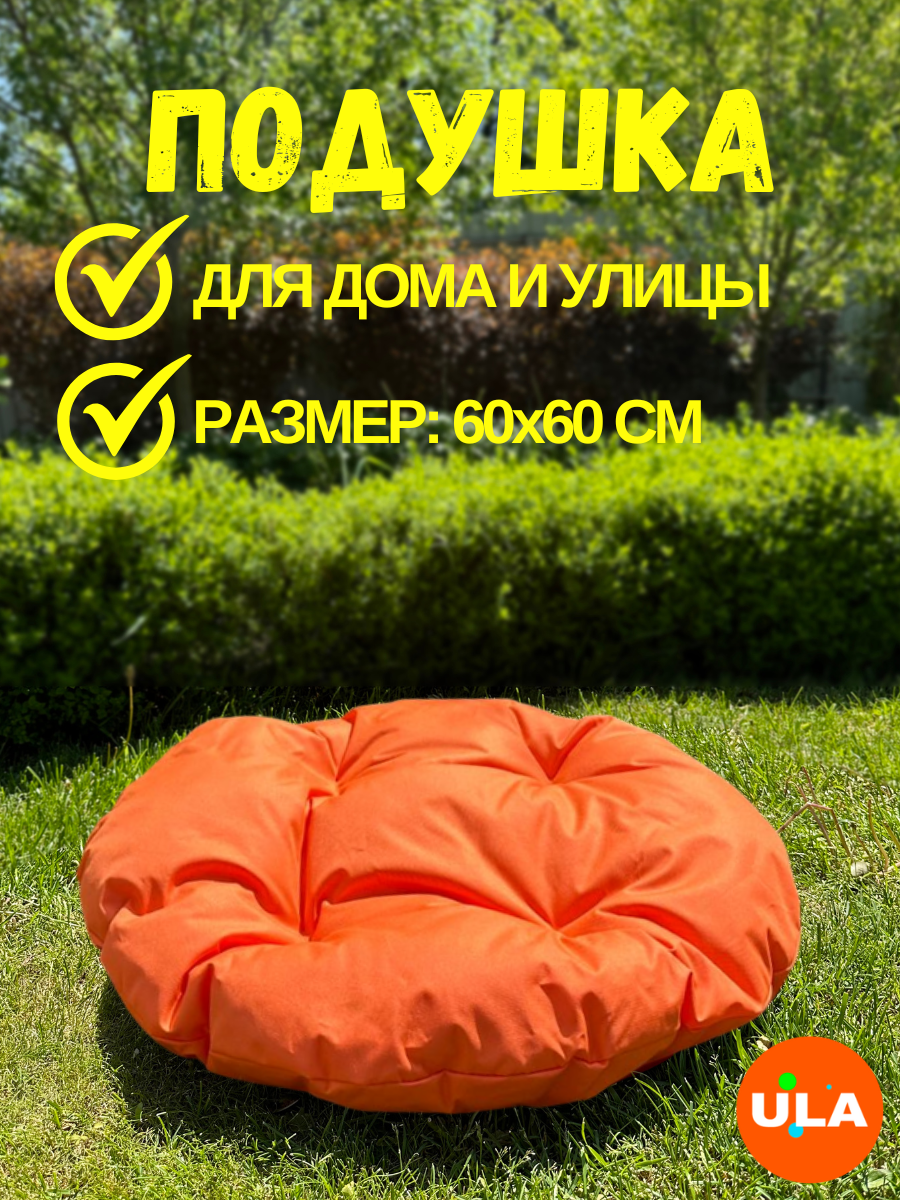 Мягкая подушка серии ULA Производство Россия! Цельная подушка выполнена из специальной ткани "Оксфорд" с мягким наполнителем. В качестве наполнителя, в отличии от аналогов, не используются гигроскопичные отходы текстильного производства. Заводское изготовление. - диаметр "подушки": 60 х 60 см - цвет оранжевый Можно использовать в закрытых и открытых помещениях, на улице и дома. Для детских качелей "Гнездо", Для животных, Для кресла, Для подвесного кресла, Для садового кресла.