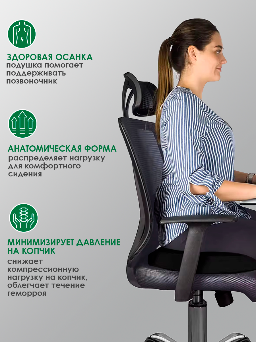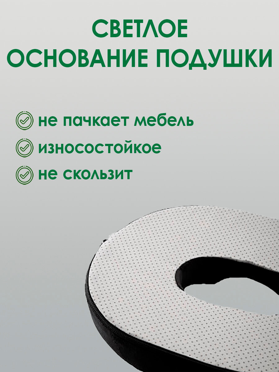 Подушка кольцо с отверстием Бублик решает проблемы, связанные с долгим сидением. Противопролежневая подушка, которую можно использовать на любом сидении, улучшает кровообращение, снижает компрессионную нагрузку на копчик, поддерживает позвоночник. Способствует предотвращению таких заболеваний как остеохондроз, грыжа поясничного отдела и геморрой. Использование подушки с дыркой из полиуретана не только повышает комфорт при сидении, но и снижает синдром хронической усталости, а также улучшает осанку.