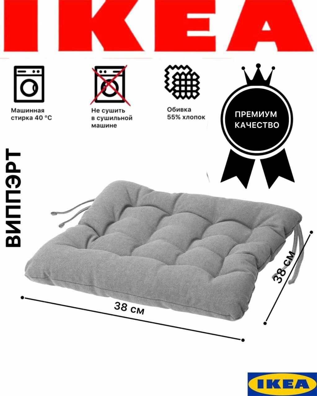 Подушка Икеа Виппэрт на стул со спинкой с сиденьем 40х40. Сидушка двусторонняя с завязками для кухни и комнаты, серая, хлопок, полиэстер, пенополиуретан, 38х38*6,5см: сравнение цен, характеристики, фото, актуальное наличие и цены.