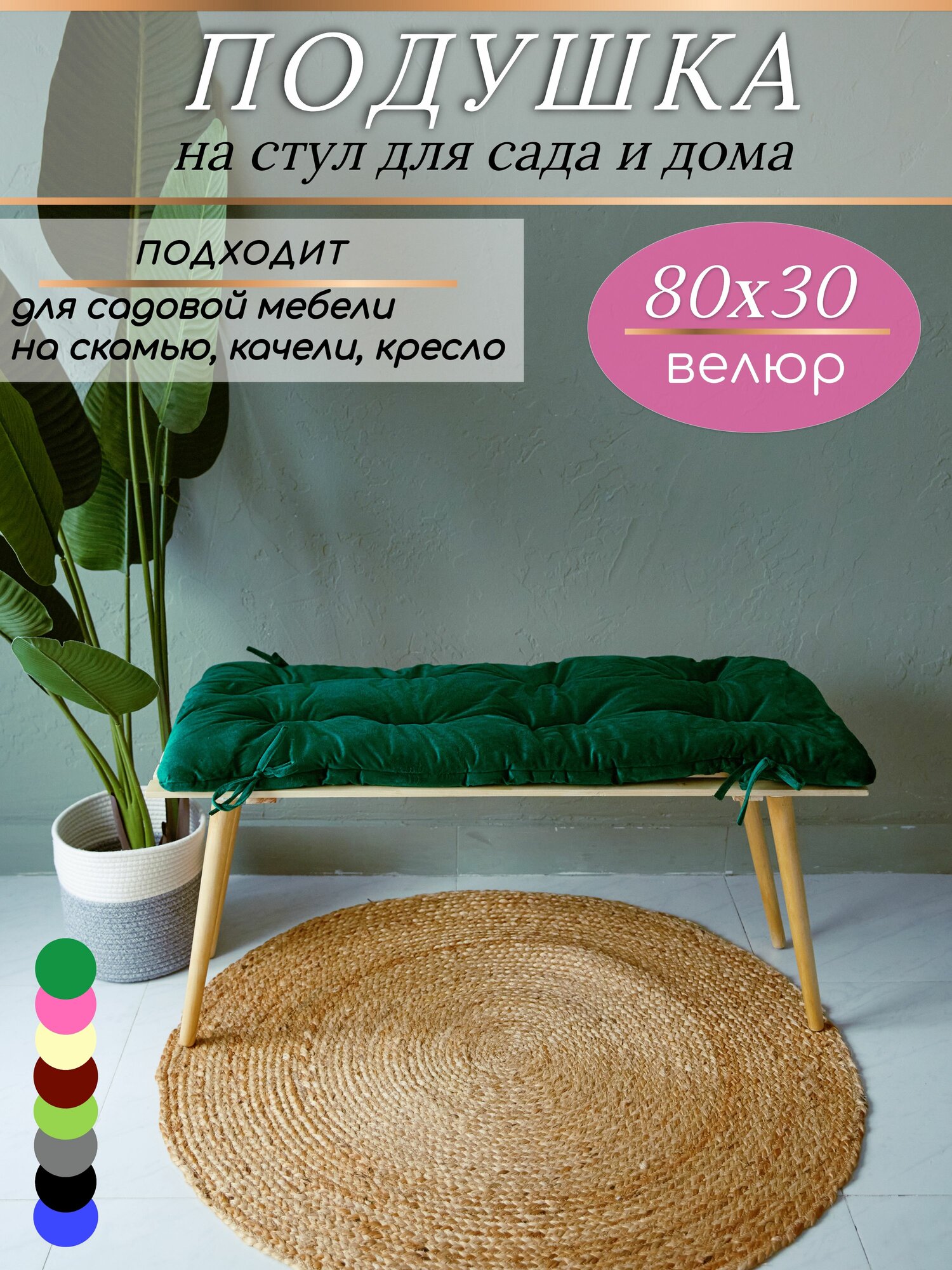 Матрас для скамьи, который может использоваться в различных ситуациях. Будь то кресло качалка, подвесные качели, кемпинг с друзьями или гамак для наслаждения природой – наш матрац станет вашим незаменимым спутником в любом месте и в любое время. Размер 80х30 (+-2) см. Подушка для банкетки, на обувницу в прихожую как сидушка, изготовленная из износостойкой ткани мебельный велюр, что делает наш садовый матрас простым в уходе, а также стойким к истиранию. У сиденья для качелей предусмотрены завязки для удобного крепления матраса на скамейке. Наш матрас для шезлонга идеально подходит на подоконник, для лавочек и лежаков, в беседку, на веранду в кафе, в офисе, на работе, на детские качели. Сидушка на скамейку легкая и мягкая. Отлично сохраняет форму, благодаря современному гипоаллергенному наполнителю холлофайбер, который не скатывается и не слеживается при долгом сидении. Износостойкую и плотную подушку матрас с завязками можно использовать внутри дома, на балконе, на кухне, улице, даче, в саду, на лужайке, на качелях, подойдет как накидка для сидения. Этот уличный вариант матраса для сада превратит вашу жесткую садовую мебель в комфортное место для отдыха. Благодаря плотной и износостойкой подушке с завязками, наш матрас будет служить вам долго, сохраняя свой прекрасный вид. Отлично подойдет для садовой скамьи из ротанга, шезлонга, кресла, как уличная подушка. Этот уютный предмет легко подарить друзьям и близким как подарок на дачу, на новоселье, на день рождения. Велюр для улицы подходит только для сухой погоды. Он идеально подходит для обновления интерьера к пасхе. Идеальный подарок для женщины, для любимой мамы, для бабушки. Внимание! Доставляется в прессованном состоянии, поэтому при получении подушку необходимо взбить и оставить на время для наполнения воздухом.