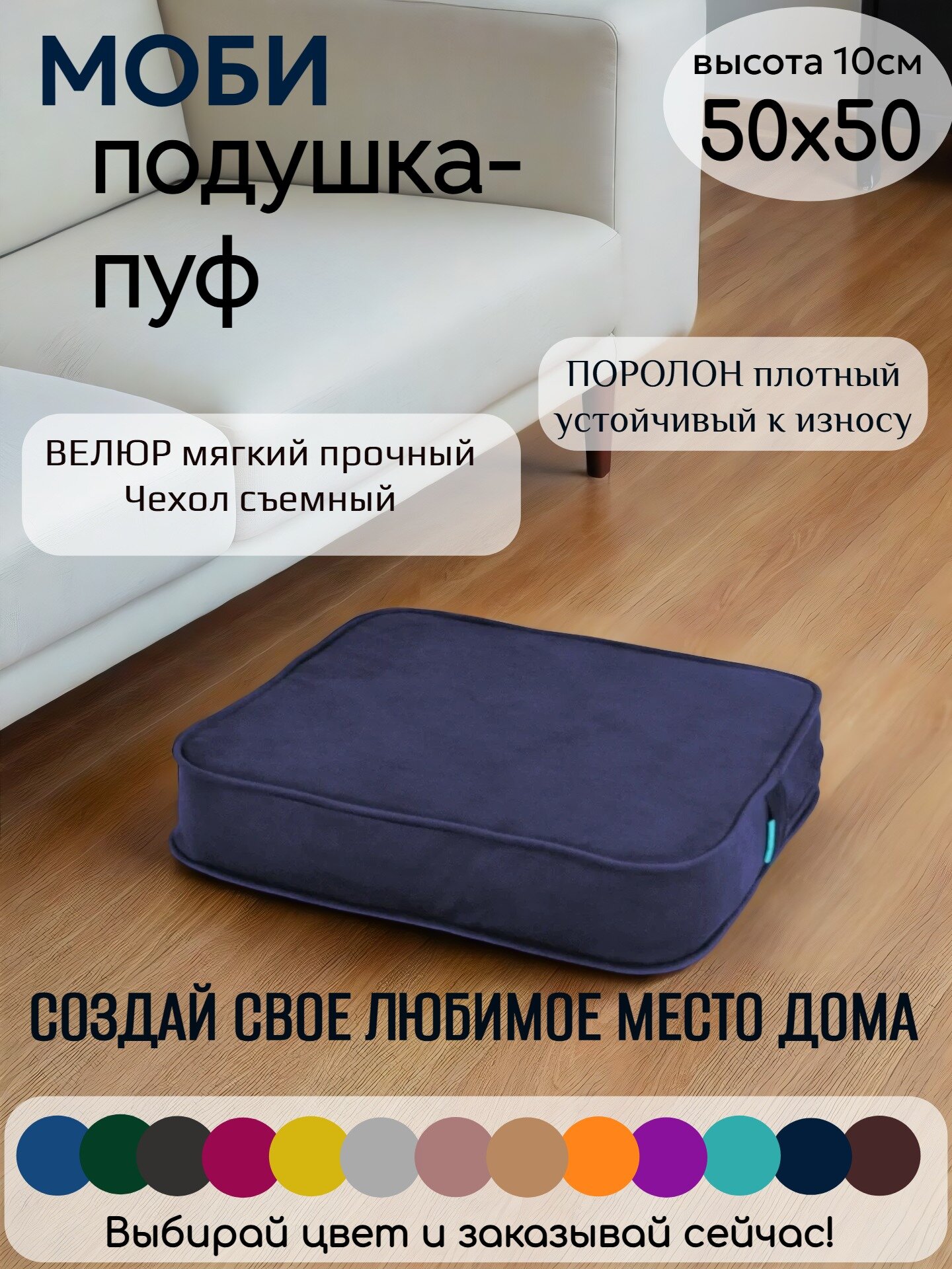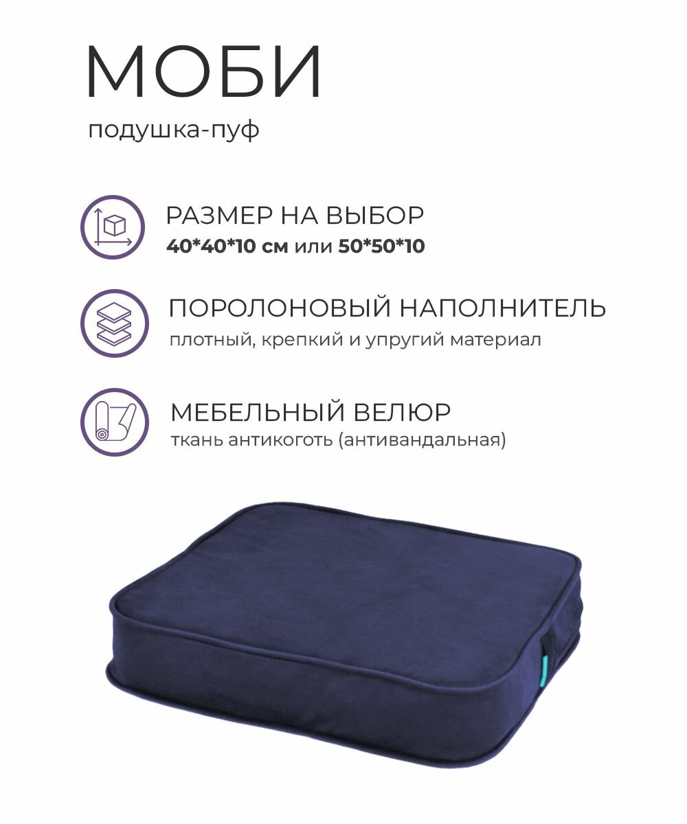 Подушка на стул МОБИ 50*50 см, для кресла, сиденья, скамейки, паллет, пола, съёмный чехол, поролон/велюр (темно-синий/кобальт): сравнение цен, характеристики, фото, актуальное наличие и цены.