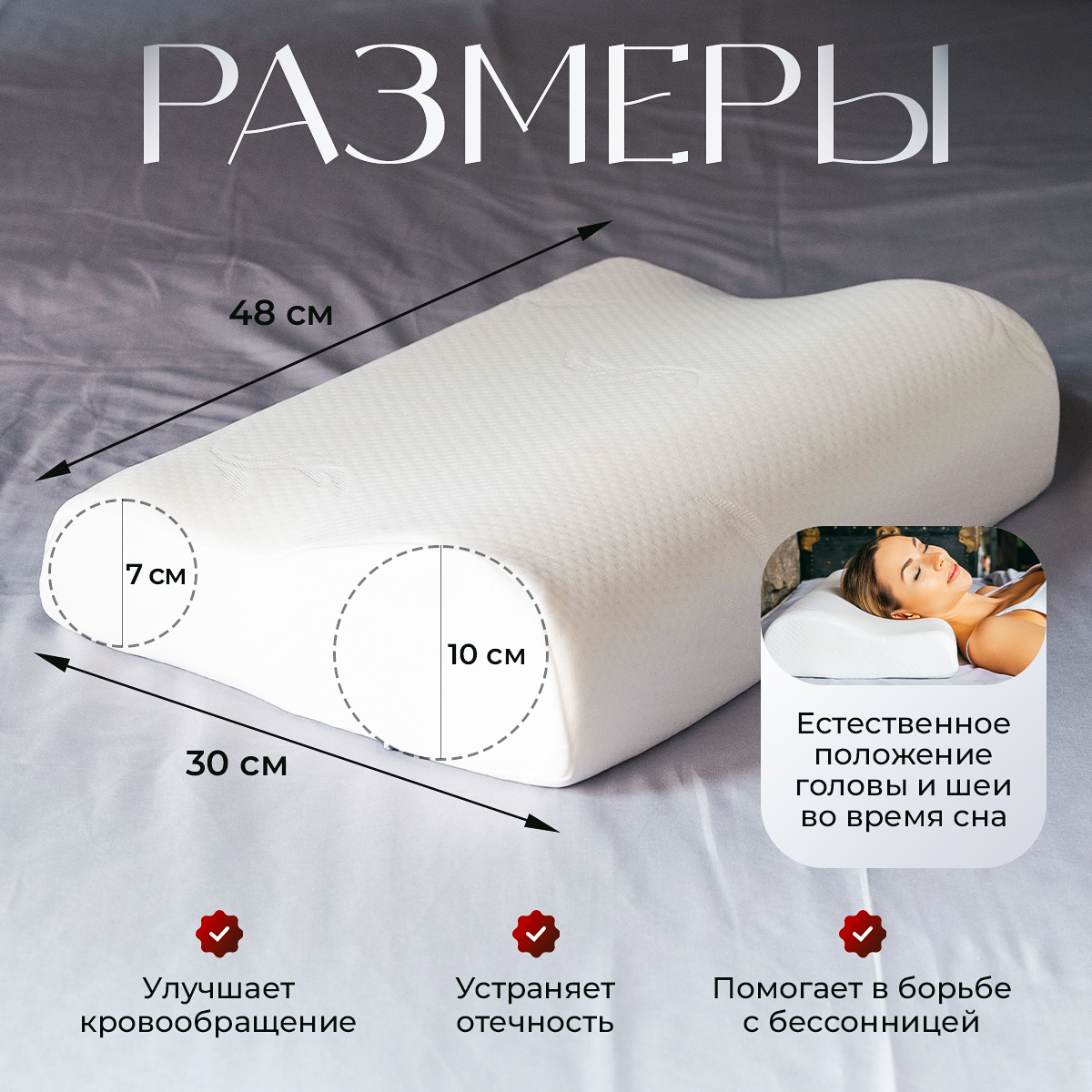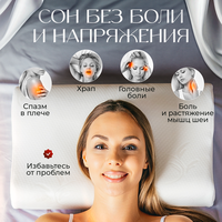 Специальная анатомическая форма адаптируется к контурам вашего тела и обеспечивает необходимую поддержку шеи и головы в любом положении во время сна. Это не только снижает нагрузку на позвоночник и мышцы, но и улучшает кровообращение и уменьшает давление на мышцы и суставы, что особенно важно для тех, кто страдает болями в спине и пояснице, а также для беременных женщин или людей, которые ведут малоподвижный образ жизни или мало спят.