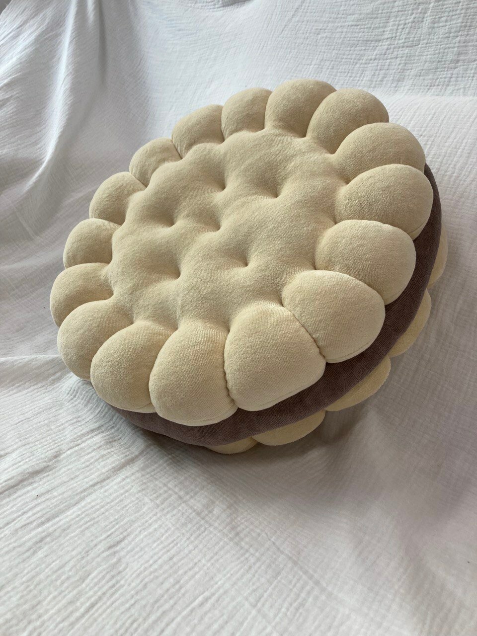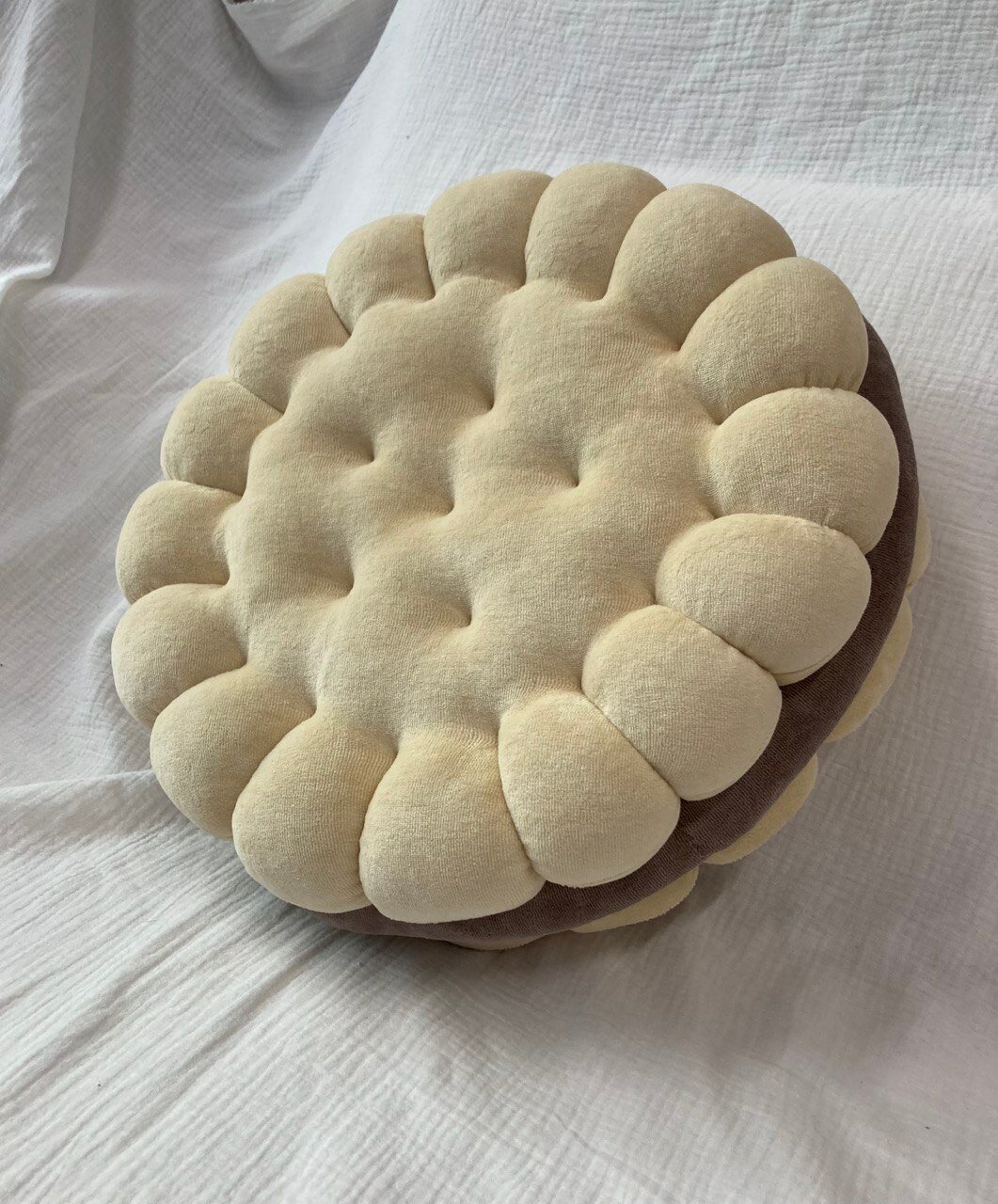 Подушка выполнена в форме печенья с кремом, что обязательно приведет в восторг детей и взрослых. Она добавит оригинальности и уюта в детскую комнату и дом в целом.