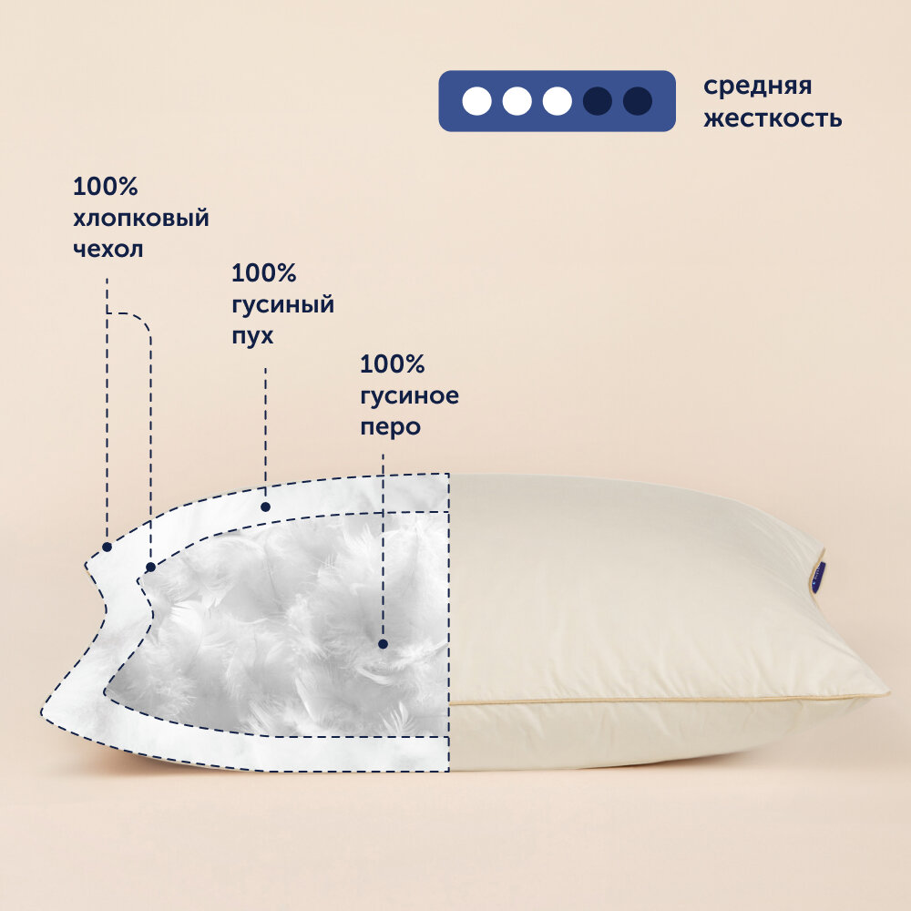 В основе подушки лежит натуральный гусиный пух и перо первой категории, используемый как во внешней, так и во внутренней камере. Внешняя камера заполнена 100% гусиным пухом, внутренняя – 100% гусиное перо, что обеспечивает оптимальный баланс упругости и мягкости. Благодаря этому, подушка невероятно легкая и воздушная, идеально подстраивается под форму вашей головы и шеи.